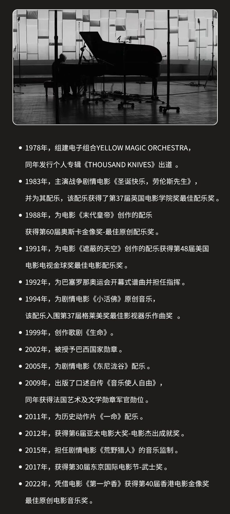 6月14日,坂本龙一&久石让经典作品音乐会邀你走进云南省大剧院,用音乐与两位先生隔空相见,致敬“坂本龙一”,遇见“久石让”。