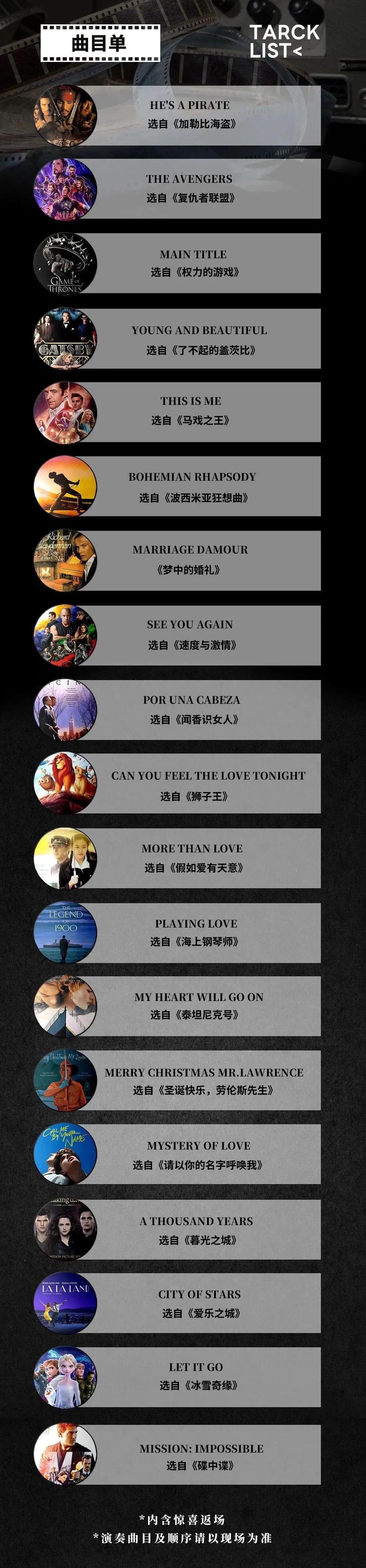 在温暖的烛光中,他们的乐声将带领观众重温《加勒比海盗》《权力的游戏》《海上钢琴师》《马戏之王》《爱乐之城》《泰坦尼克号》《请以你名字呼唤我》等多部经典电影主题曲配乐,这些旋律曾伴随了无数人的青春时光,欧洲之声的演绎将制造出与中国乐迷之间全新的情感纽带。