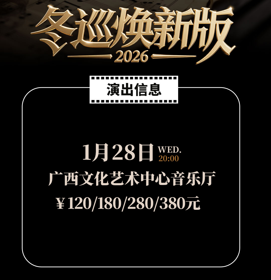 演出时间 2026-01-28 星期三 20:00 演出场馆 广西文化艺术中心 演出时长 以现场为准 儿童入场提示 儿童一律凭成人票入场 演出详情