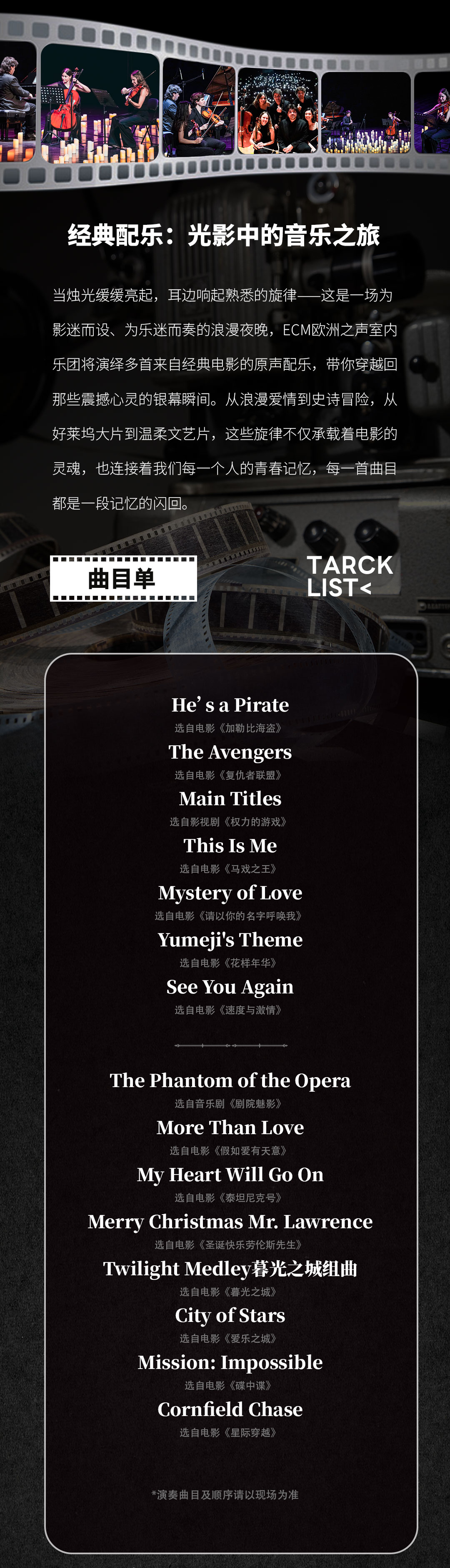 好莱坞电影金曲与烛光交织,ECM乐团为您呈现视听盛宴在烛光晕染的温柔里,金曲化作时光的信笺,邀您回溯电影中的璀璨传奇!