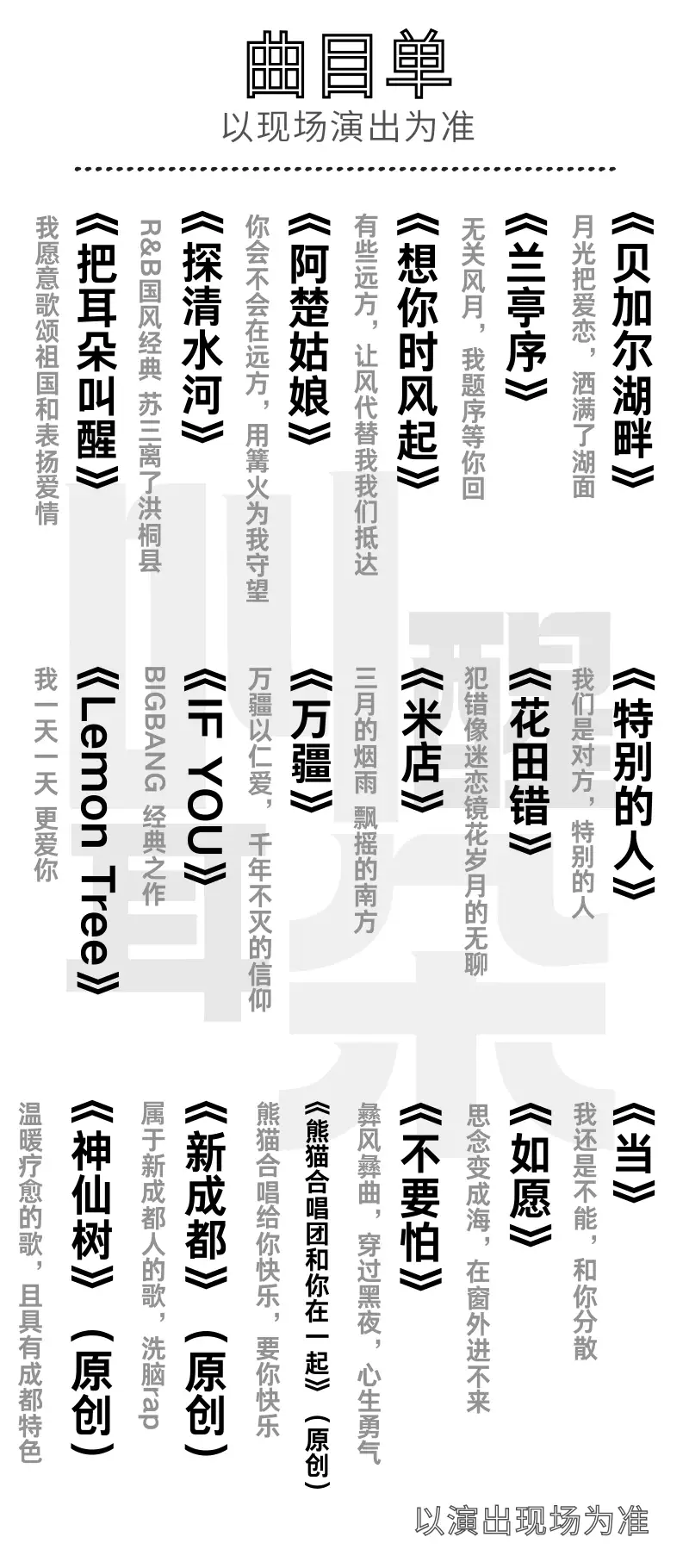 新增国风大作《万疆》,BIG BANG经典曲目《IF YOU》以及致敬R&B天才音乐人的《特别的人》,领唱娓娓道来《想你时风起》,合唱团浅吟呼应;轻爵士律动的《把耳朵叫醒》,《Lemon Tree》;经典婉约派国风《兰亭序》等洗耳曲目十余首。