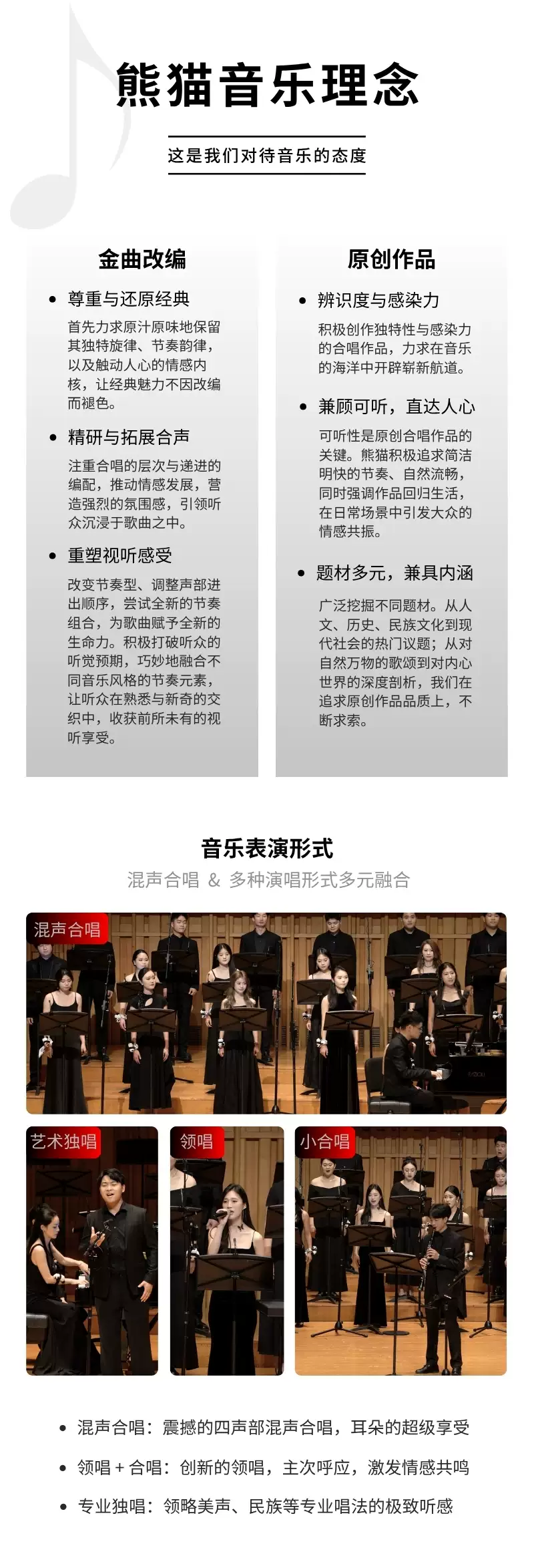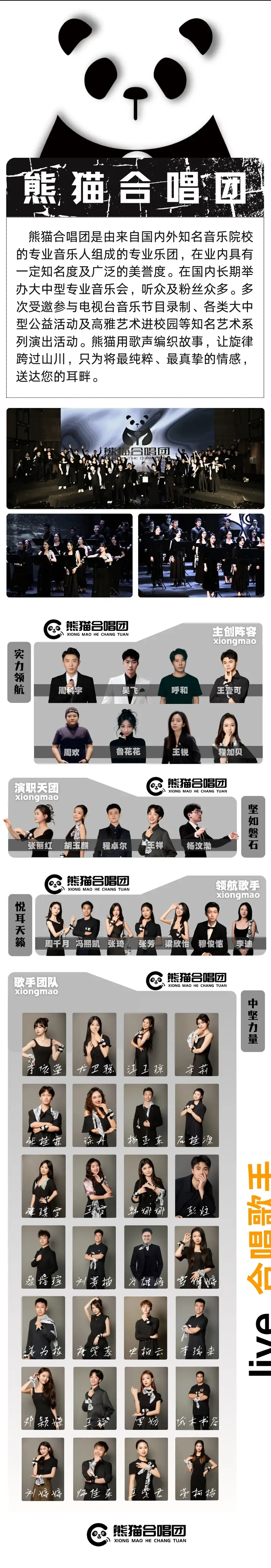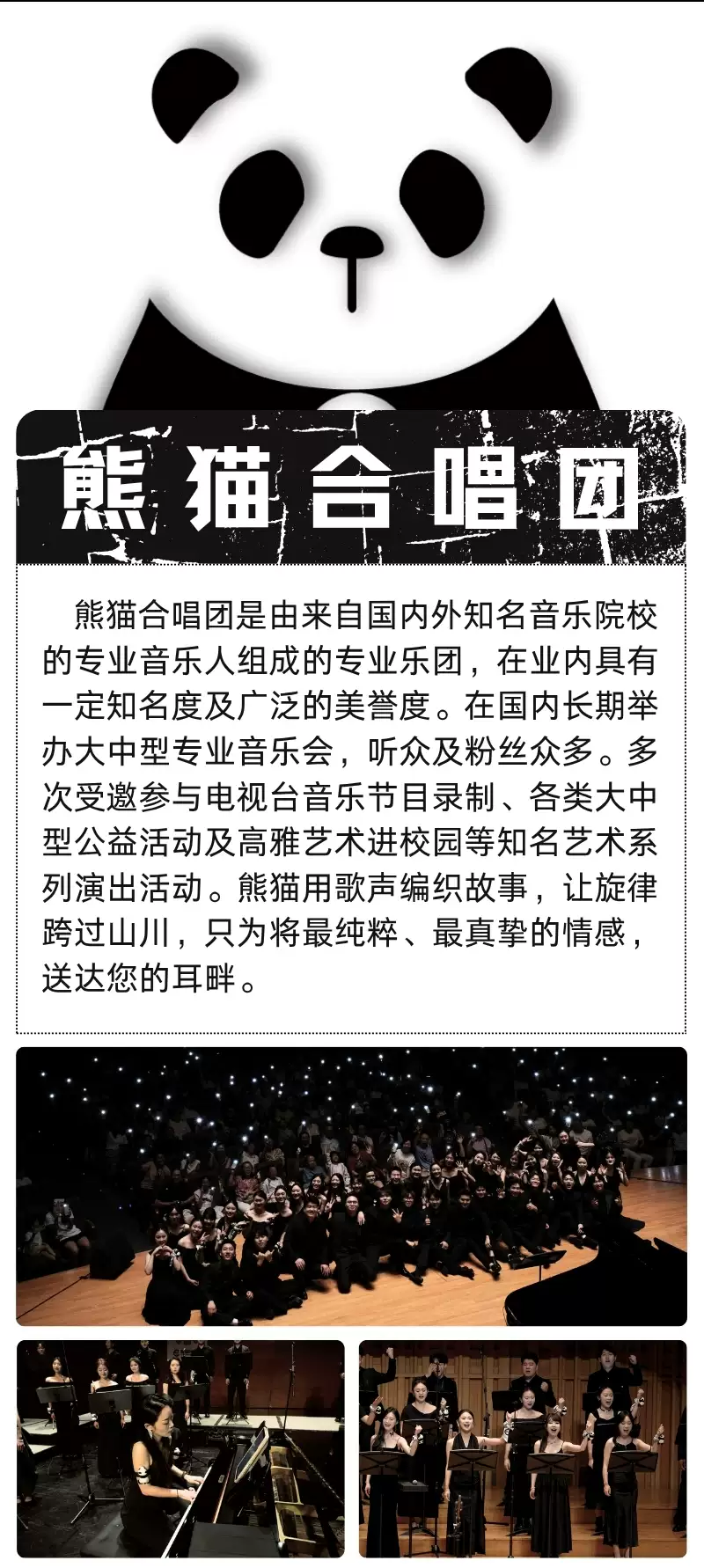 由来自国内外知名音乐院校的专业音乐人组成的专业乐团,在业内具有一定知名度及广泛的美誉度。在国内长期举办大中型专业音乐会,听众及粉丝众多。多次受邀参与电视台音乐节目录制、各类大中型公益活动及高雅艺术进校园等知名艺术系列演出活动。熊猫用歌声编织故事,让旋律跨过山川,只为将最纯粹、最真挚的情感送达您的耳畔。