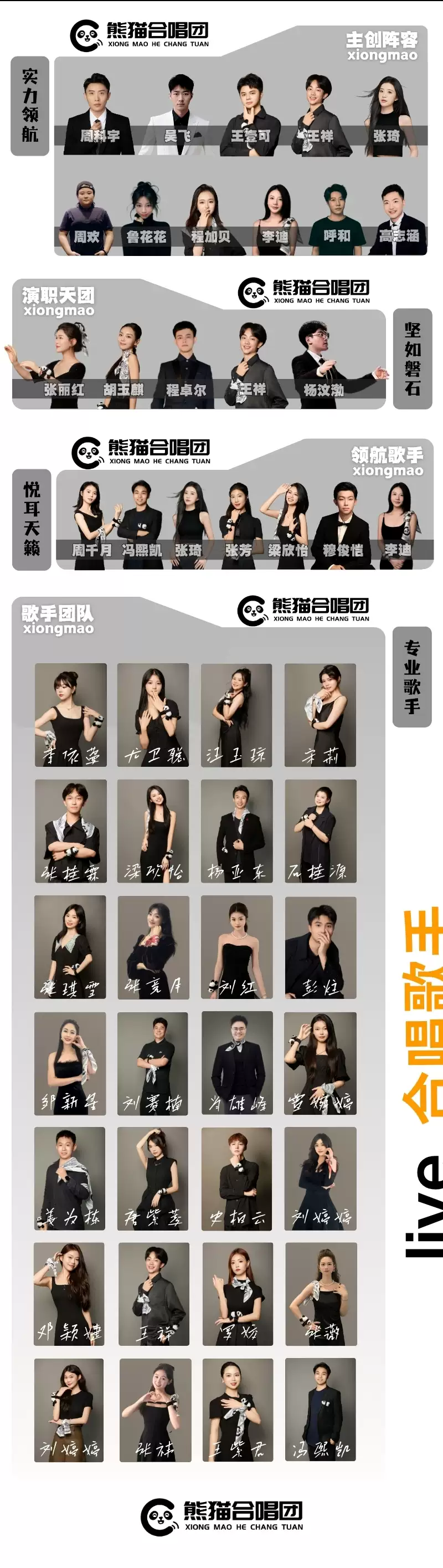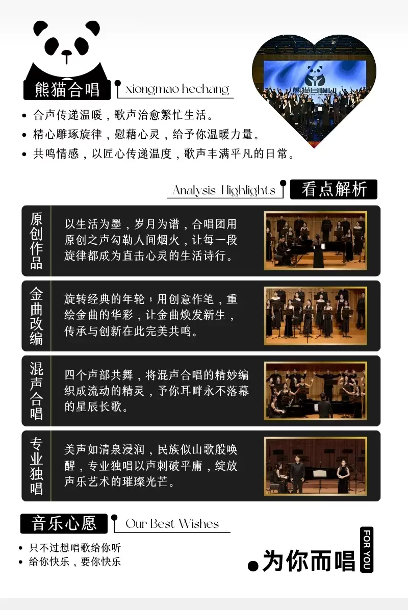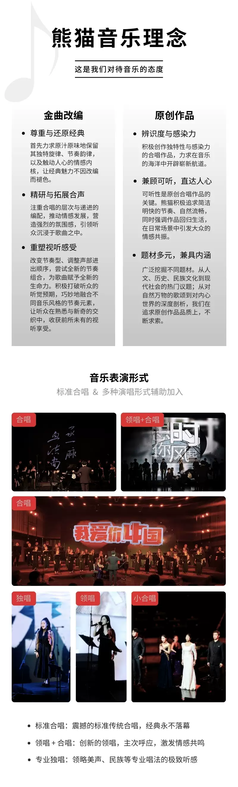 由来自国内外知名音乐院校的专业音乐人组成的专业乐团,在业内具有一定知名度及广泛的美誉度。在国内长期举办大中型专业音乐会,听众及粉丝众多。多次受邀参与电视台音乐节目录制、各类大中型公益活动及高雅艺术进校园等知名艺术系列演出活动。熊猫用歌声编织故事,让旋律跨过山川,只为将最纯粹、最真挚的情感送达您的耳畔。