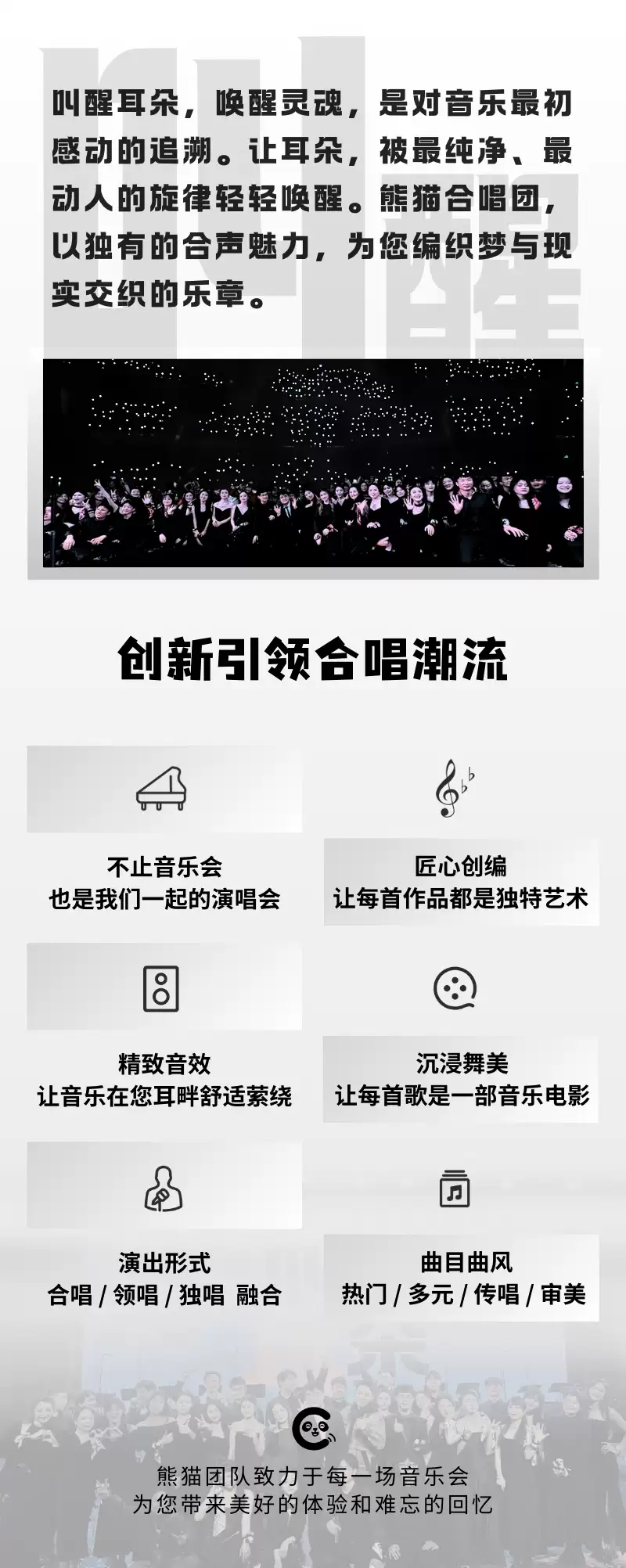 唤醒灵魂,叫醒耳朵,是对音乐最初感动的追溯。让耳朵,被最纯净、最动人的旋律轻轻唤醒。熊猫合唱团以独有的合声魅力,为您编织梦与现实交织的乐章。