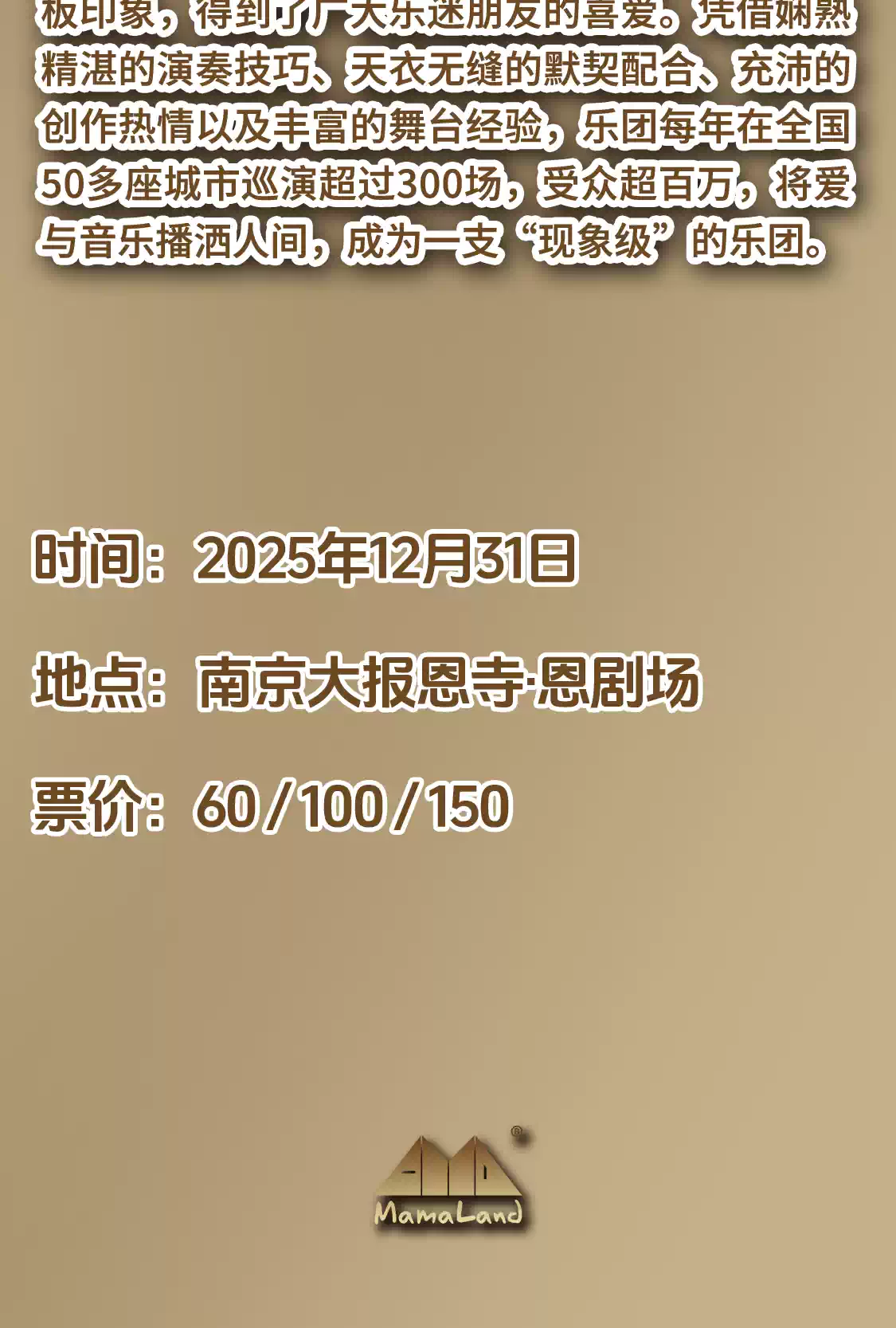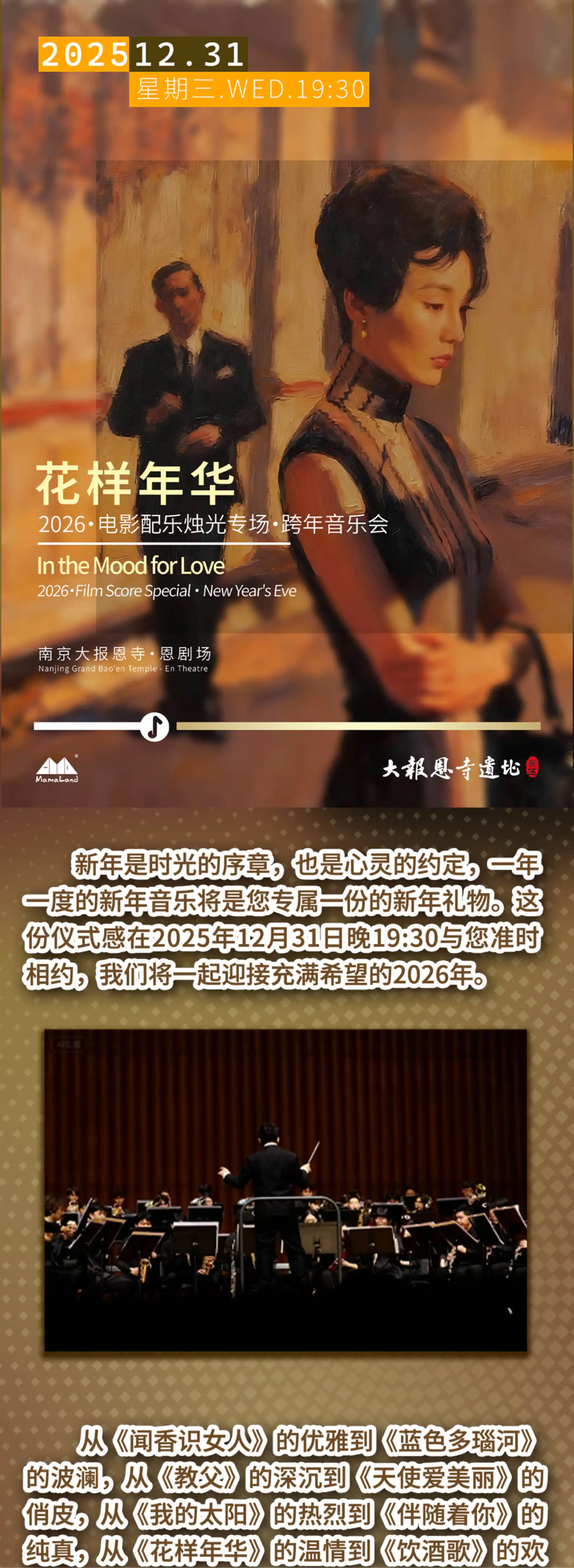 演出时间 2025-12-31 周三 19:30 演出场馆 大报恩寺遗址景区恩剧场 演出时长 以现场为准 儿童入场提示 儿童一律凭成人票入场 演出详情