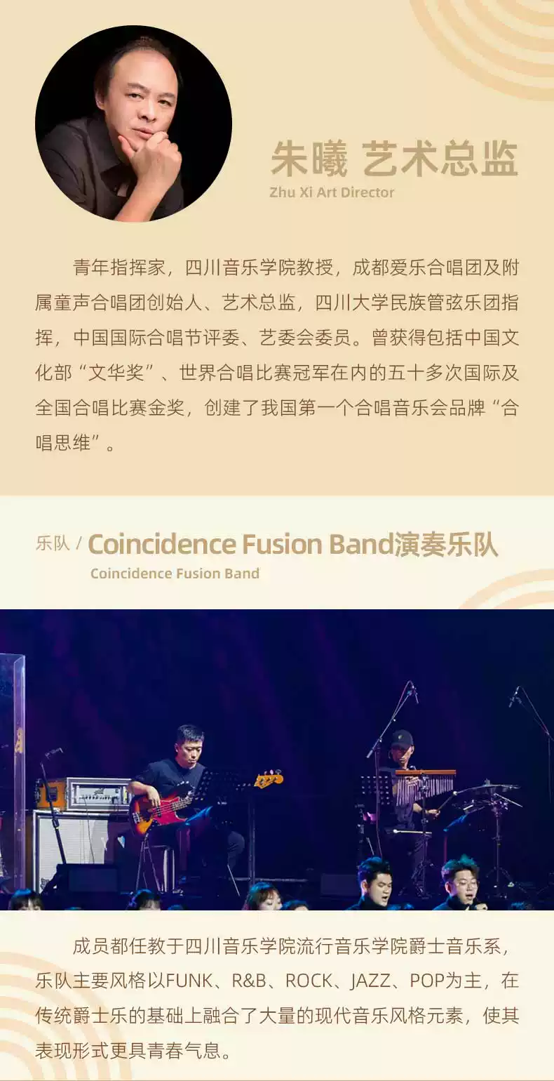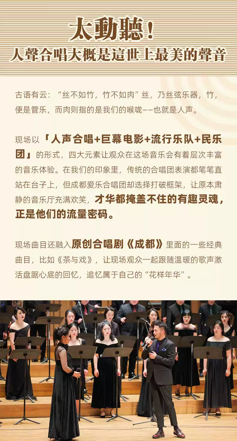 现场曲目还融入原创合唱剧《成都》里面的一些经典曲目,比如《茶与戏》,让现场观众一起跟随温暖的歌声激活盘踞心底的回忆,追忆属于自己的“花样年华"!