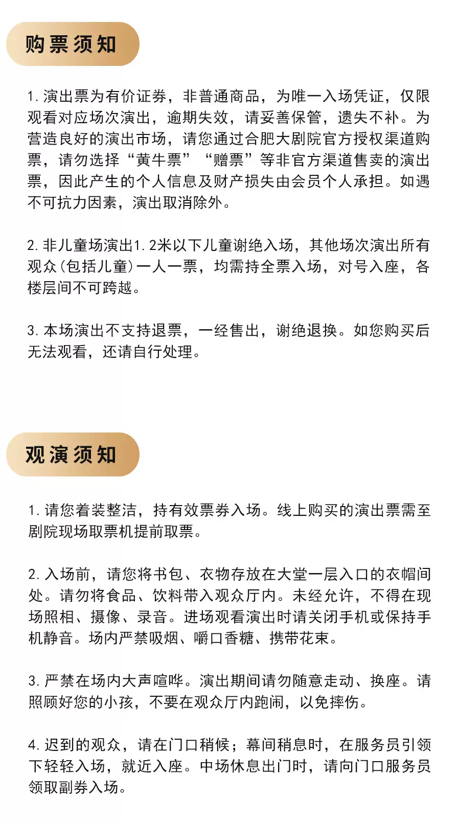 1.购买前请您提前规划好行程,做好相应准备,以免影响您的正常观演,感谢您的理解和配合。