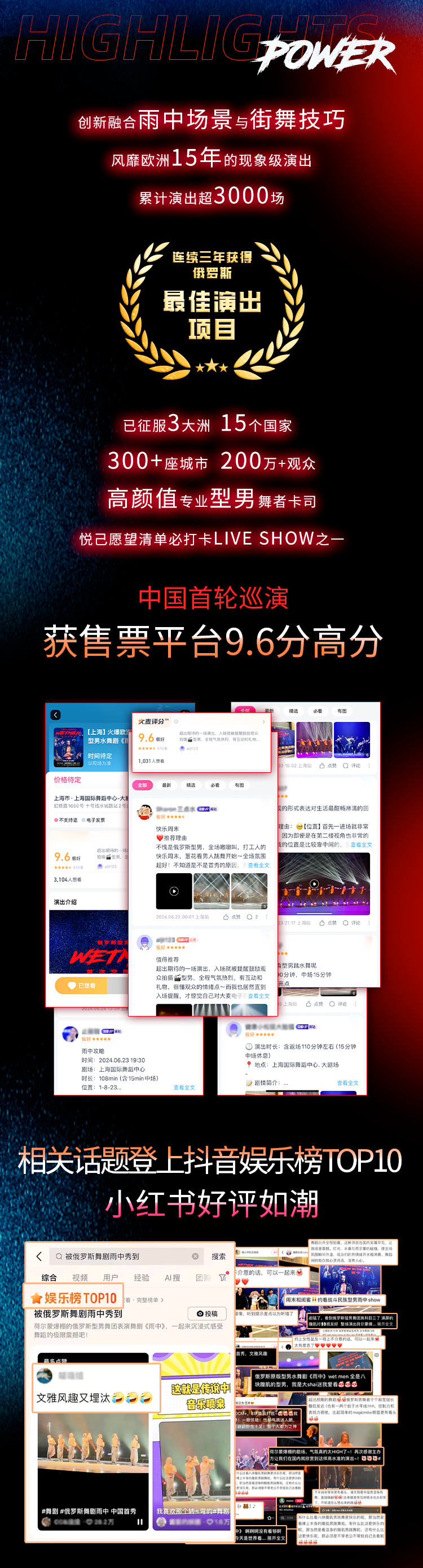 《雨中》作为火爆全球、风靡欧洲15年的现象级演出,已巡演3大洲15个国家的超300座城市,累计演出超3000场,连续三年获评「俄罗斯最佳演出项目」称号,被誉为「圣彼得堡的骄傲」。