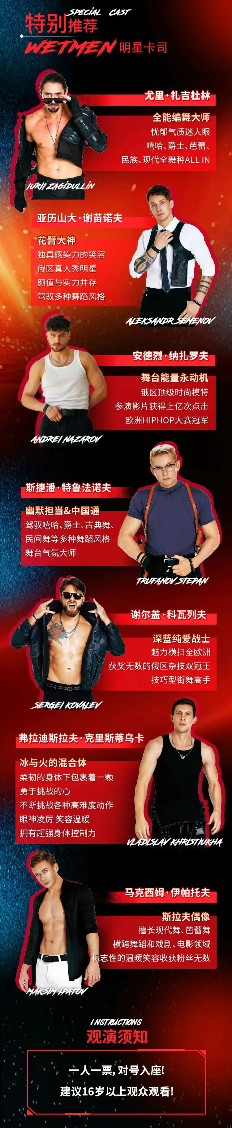本场演出的主角——“WetMen”团队被公认为是全俄最硬核的现代舞团体之一,这支型男天团由各舞类TOP级人才组成:杂技冠军、现代舞冠军、街舞冠军,并有古典舞、现代舞、街舞、芭蕾舞、霹雳舞、体操杂技等多种元素呈现,一场《雨中》将堪比一次“舞”林大会!