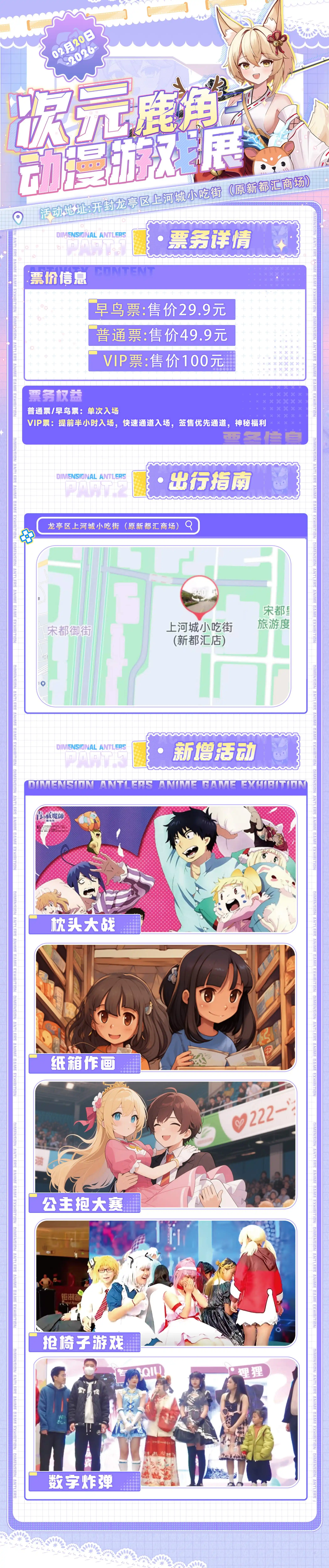 10月1日至10月2日,开封次元鹿角动漫游戏展邀你走进开封市龙亭区上河城小吃街小吃城,让热爱唤醒青春的热情,感受次元壁的碰撞。
