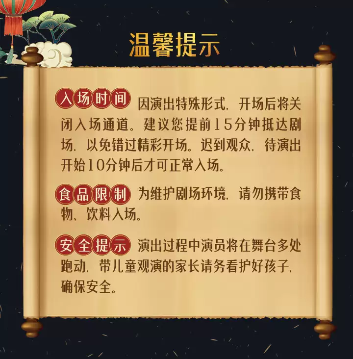 3.迟到观众需在场外等候,听从工作人员安排进场。请您合理安排出行时间,尽量提前抵达剧院,以免延误观演。