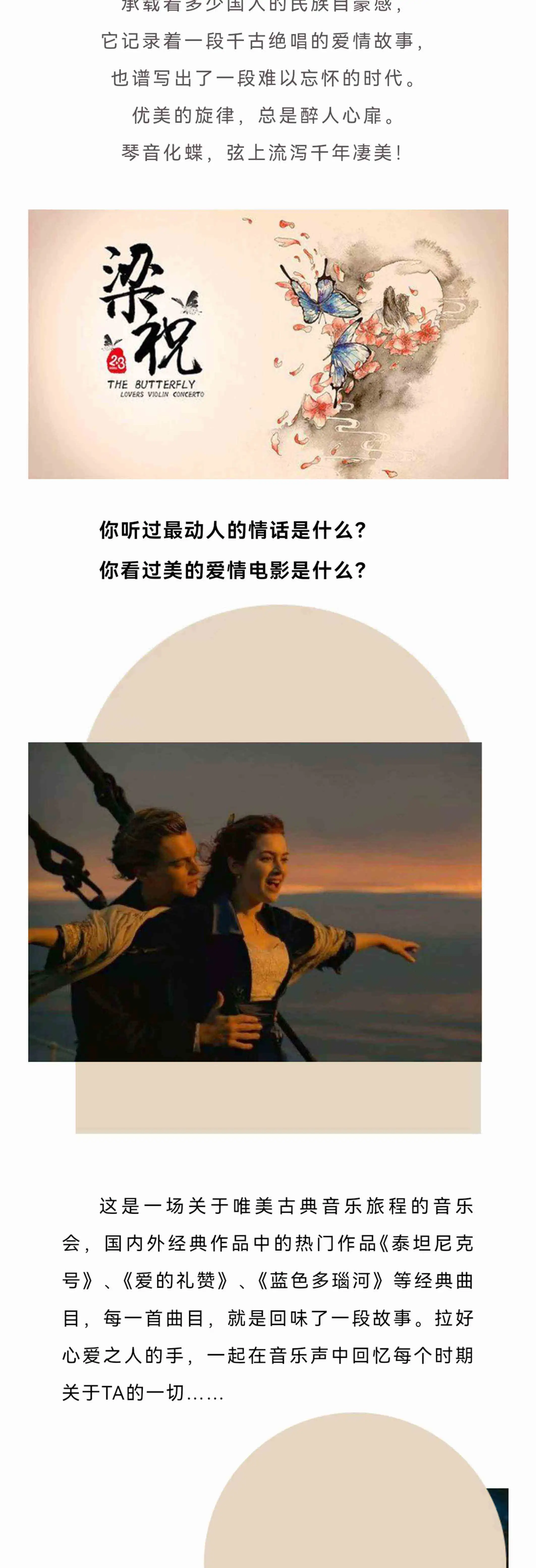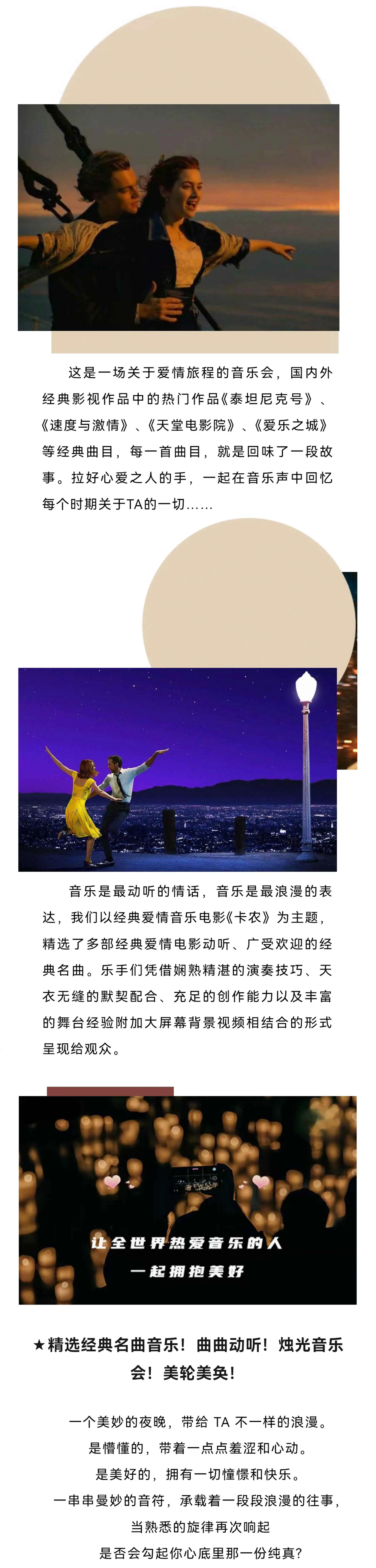 这是一场关于爱情旅程的音乐会,国内外经典影视作品中的热门作品《泰坦尼克号》《速度与激情》、《天堂电影院》、《爱乐之城》等经典曲目,每一首曲目,就是回味了一段故事。拉好心爱之人的手,一起在音乐声中回忆每个时期关于TA的一切……
