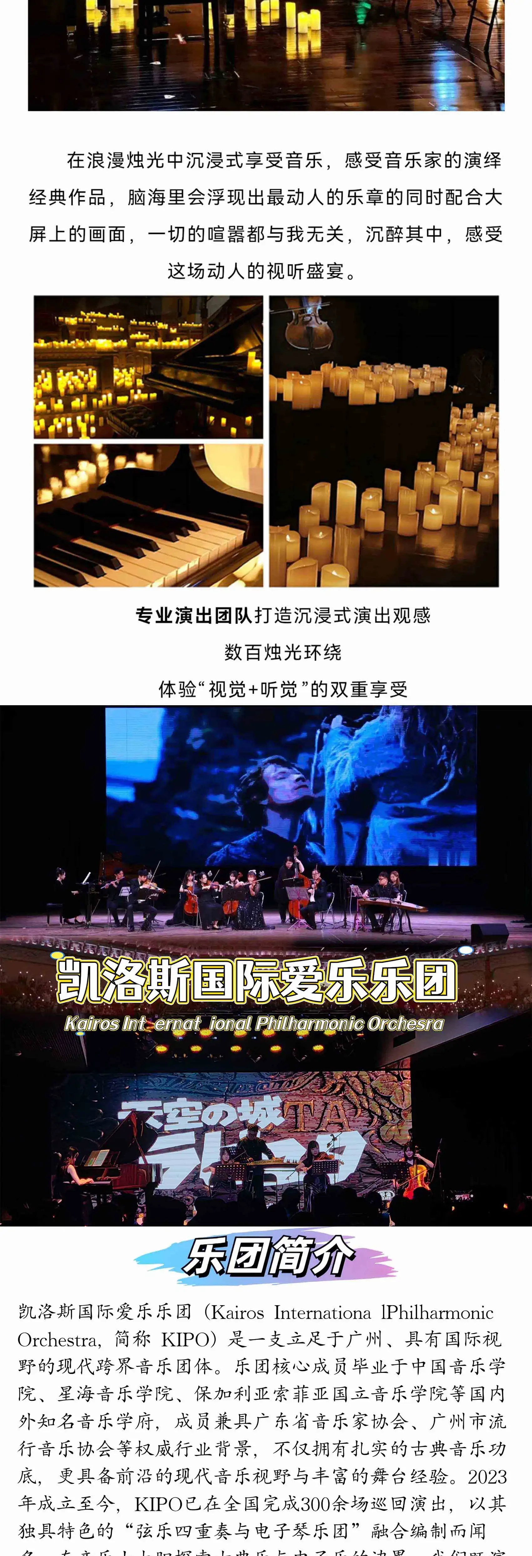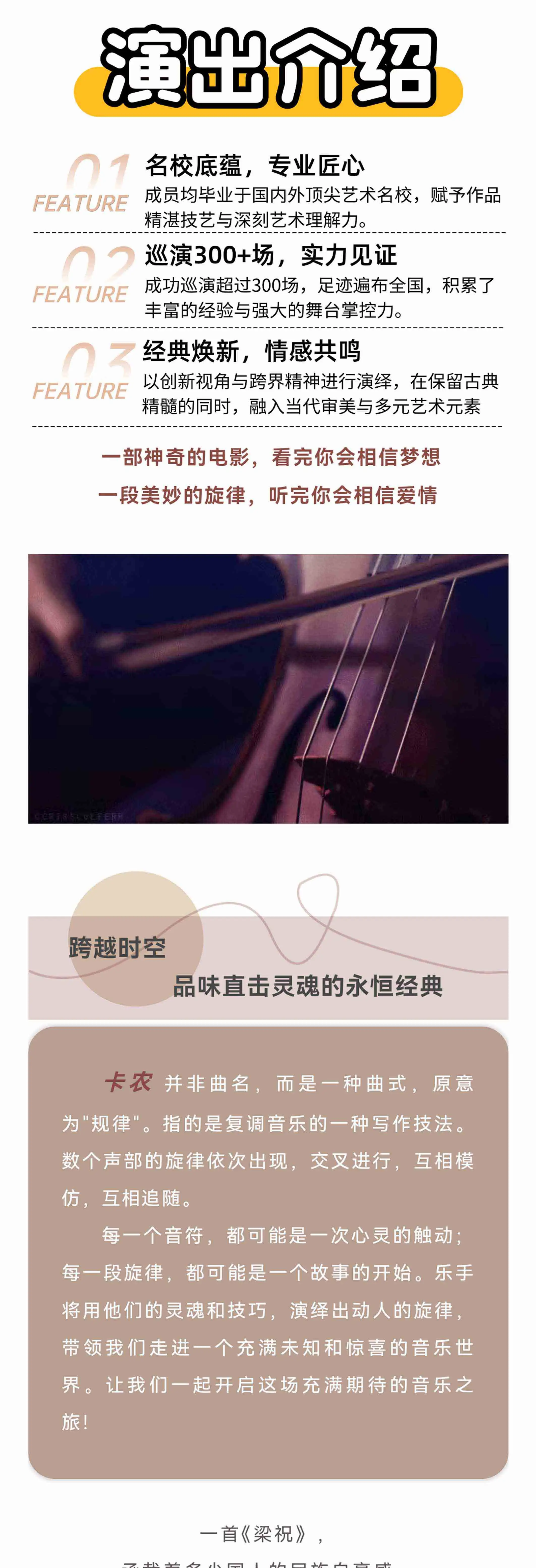 音乐是最动听的情话,音乐是最浪漫的表达,我们以经典爱情音乐电影《卡农》为主题精选了多部经典爱情电影动听、广受欢迎的经典名曲。乐手们凭借娴熟精湛的演奏技巧、天衣无缝的默契配合、充足的创作能力以及丰富的舞台经验附加大屏幕背景视频相结合的形式呈现给观众。