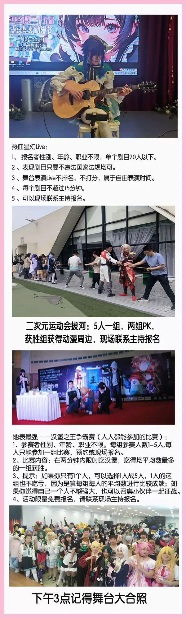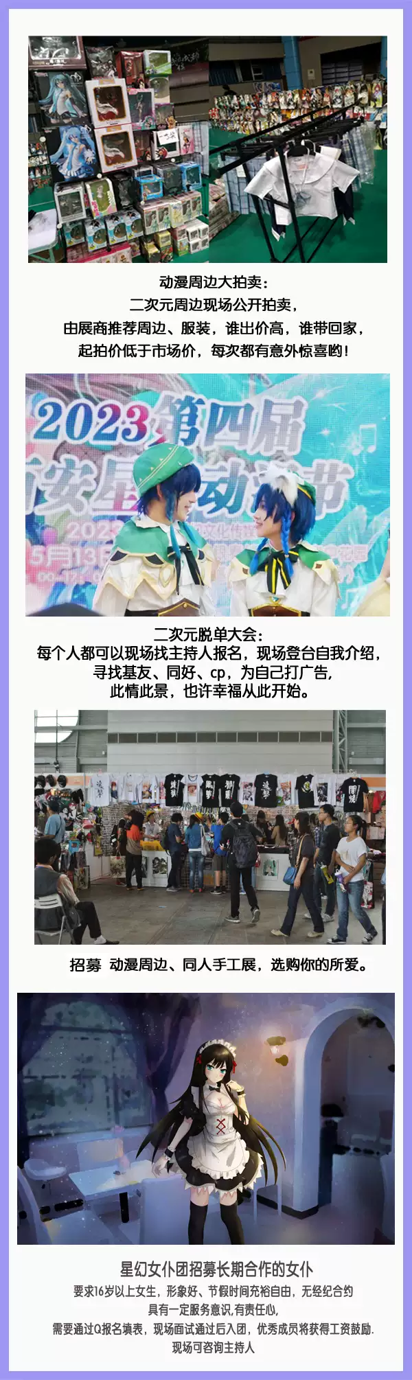 本次动漫节以二次元动漫游戏互动交流、cos拍照为主,展为其次,不限年龄、日常和cos服都可以参与,购票后不支持退换,请安排好行程后购买,以上活动安排仅为为参考,请以现场实际情况为准。