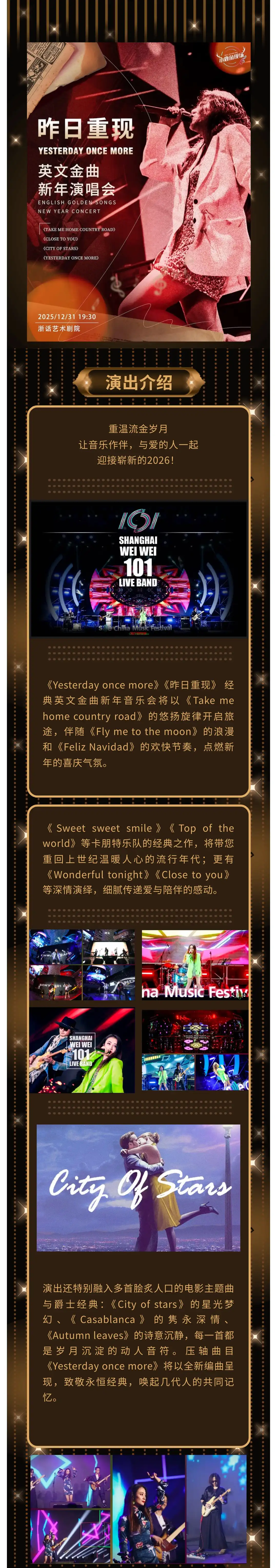 跨越半个世纪的经典,承载多少回忆,完美复刻的精选热门英文单曲,超感动的LIVE之旅,每首都能引起大合唱,一起来感受时光从耳边划过!