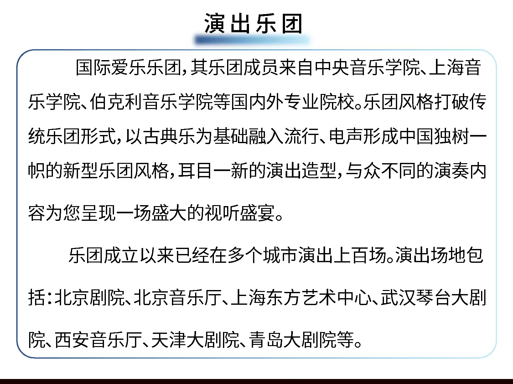 国际爱乐乐团,其乐团成员来自中央音乐学院、上海音乐学院、伯克利音乐学院等国内外专业院校。乐团风格打破传统乐团形式,以古典乐为基础融入流行、电声形成中国独树一帜的新型乐团风格,耳目一新的演出造型,与众不同的演奏内容为您呈现一场盛大的视听盛宴。