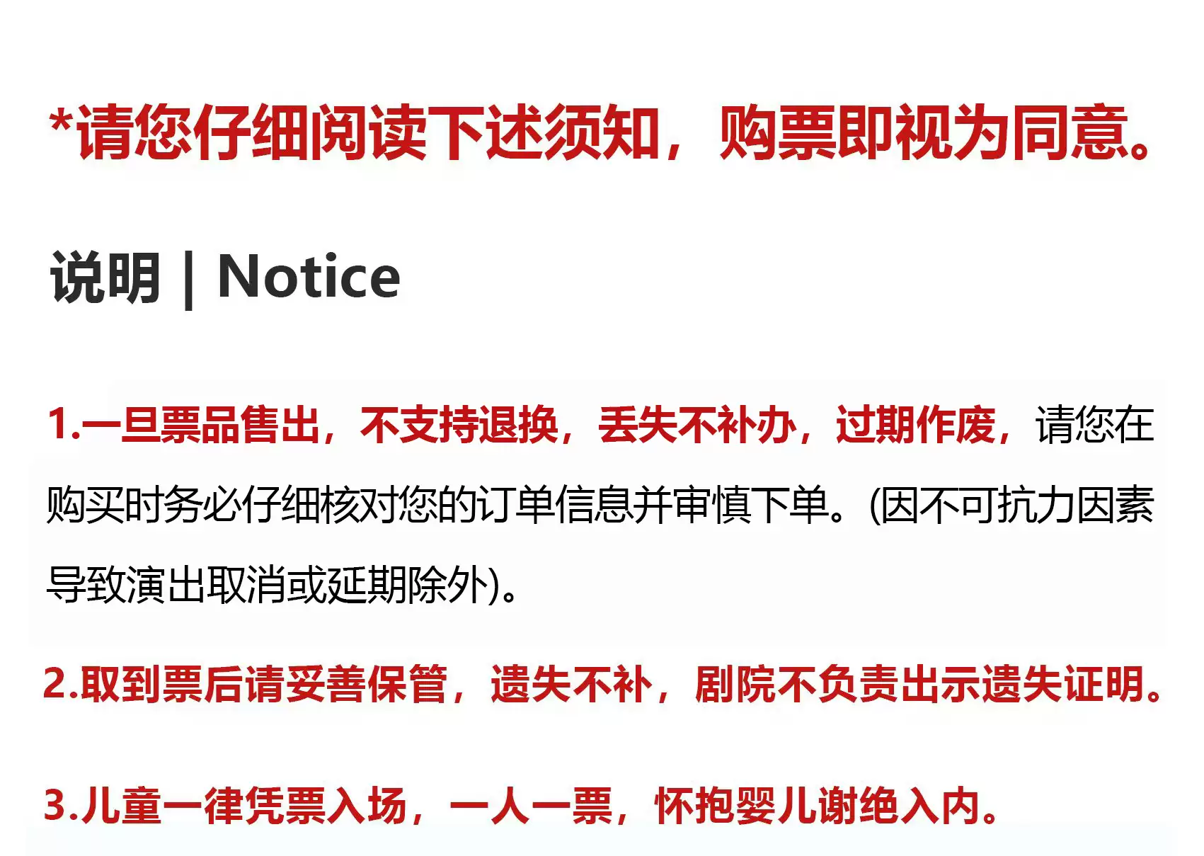票品为有价证券,非普通商品,其背后承载的文化服务具有时效性、唯一性、稀缺性等特征,如非演出变更或不可抗力因素,一经支付,不退不换,敬请谅解!