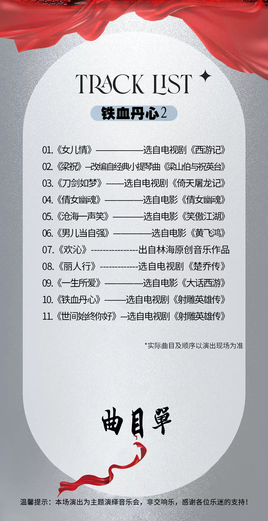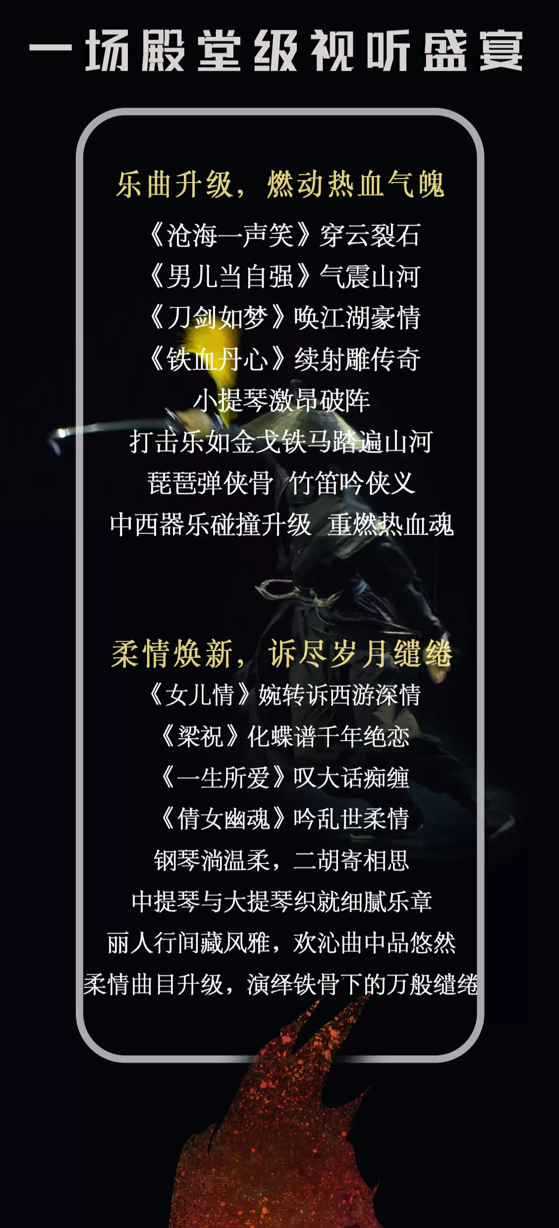 1、经典曲目再现:音乐会以金庸武侠影视作品中的经典配乐为核心,如《铁血丹心》《笑傲江湖》《沧海一声笑》等,通过室内乐等多种形式进行重新编曲,将观众带回那个充满侠义与豪情的江湖世界。