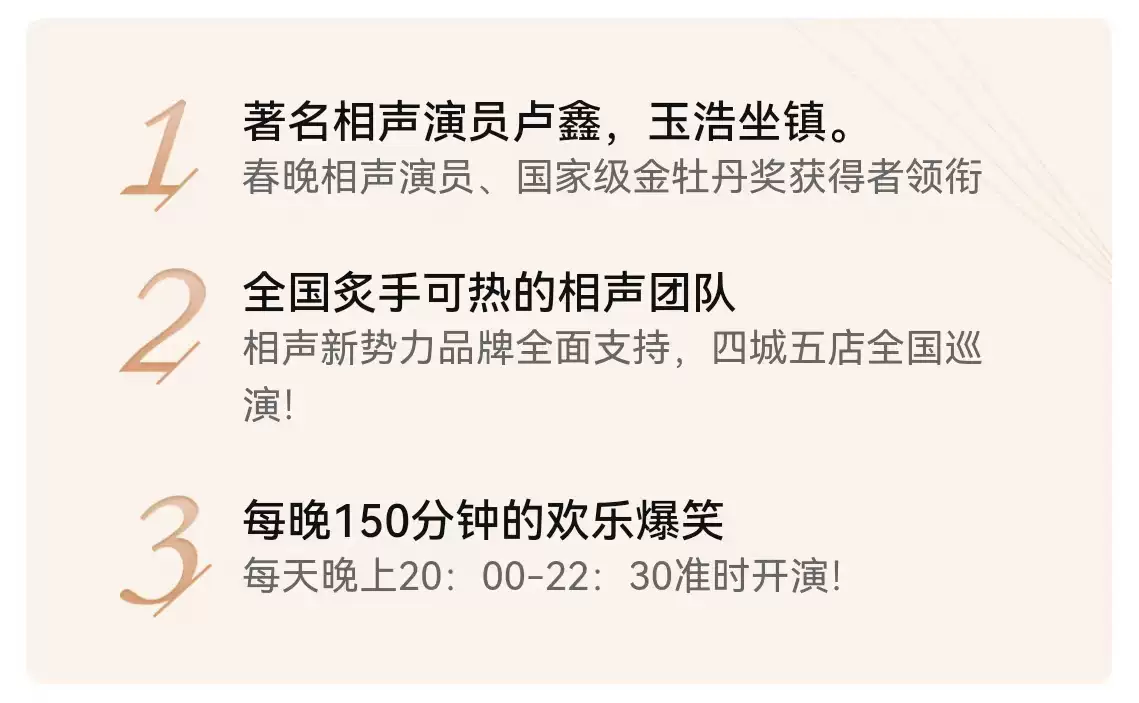 演出时间 2025.10.16-10.31 演出场馆 相声新势力应天门店 演出时长 以现场为准 儿童入场提示 1.2米以上凭成人票入场,1.2米以下谢绝入场。 演出详情