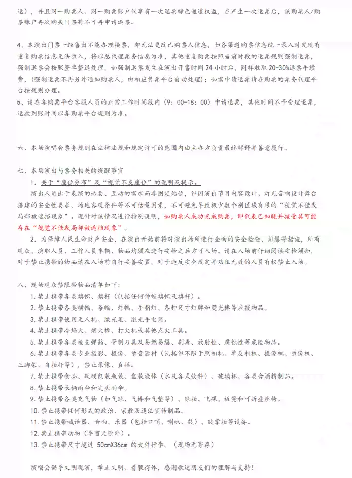 2.若演出受不可抗力影响延期或取消,本平台将对演出票订单按照项目官方通知方案进行处理,其他因观演发生的费用需由您自行承担。