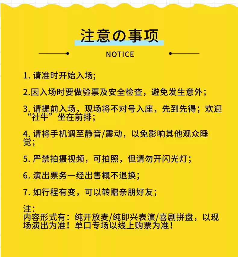 1.购买前请您提前规划好行程,做好相应准备,以免影响您的正常观演,感谢您的理解和配合。
