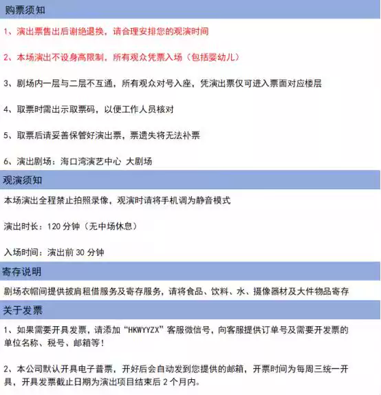 1.购买前请您提前规划好行程,做好相应准备,以免影响您的正常观演,感谢您的理解和配合。