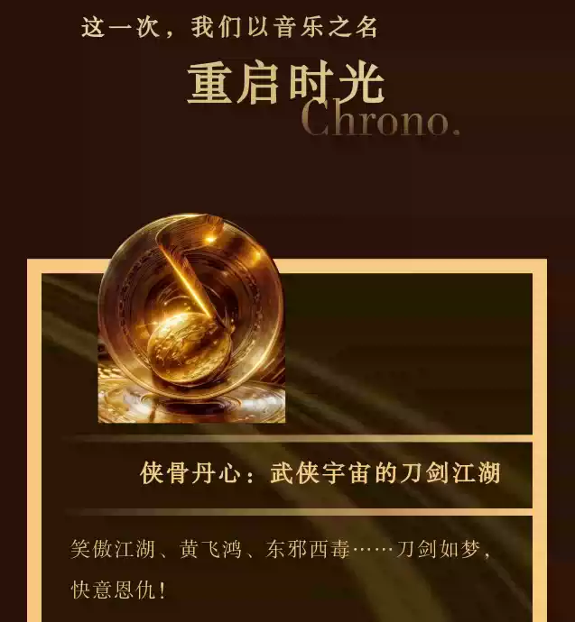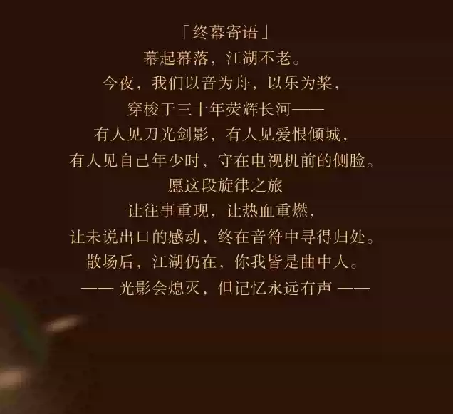 从刀光剑影的武侠江湖,到霓虹闪烁的市井街头,从荡气回肠的英雄史诗,到刻骨铭心的爱恨纠缠!邀您共赴一场跨越世代的音乐之约!