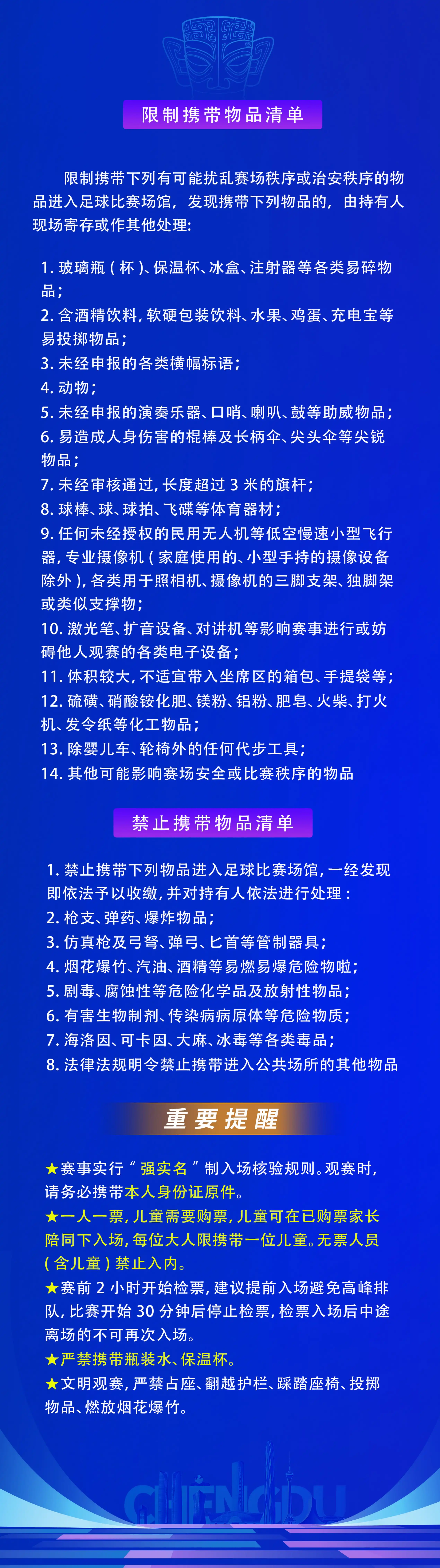 由于安保和版权的原因,大多数演出、展览及比赛场所禁止携带食品、饮料、专业摄录设备、打火机等物品,请您注意现场工作人员和广播的提示,予以配合。