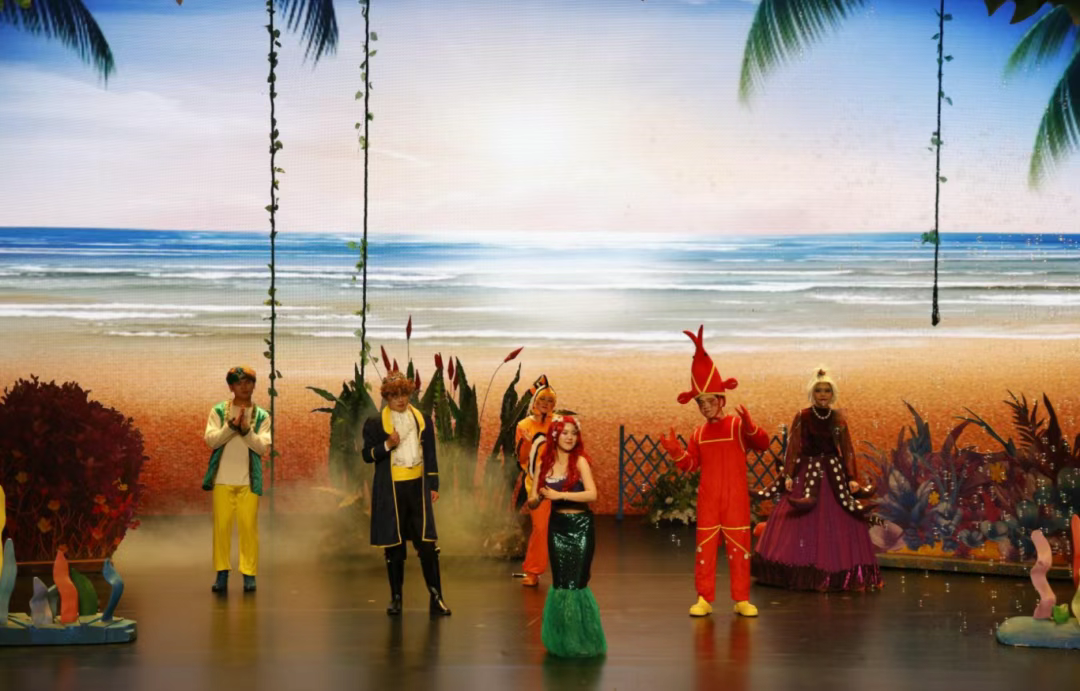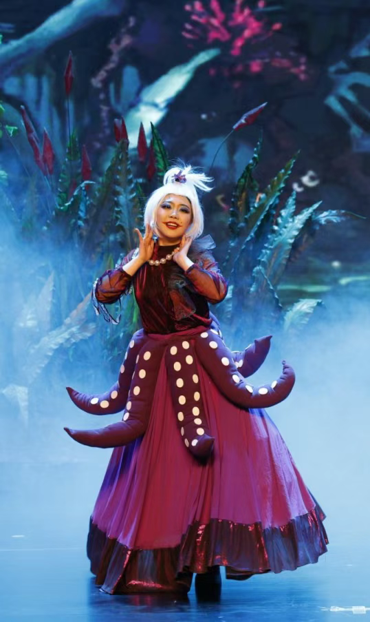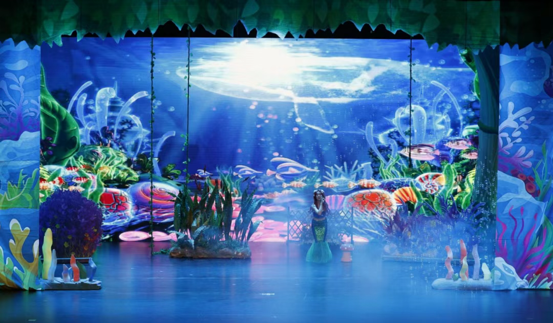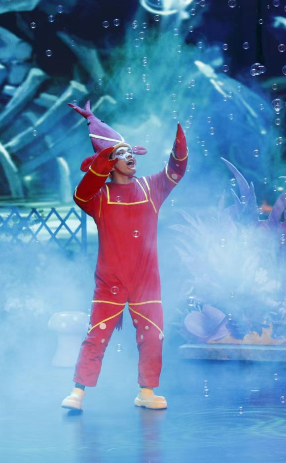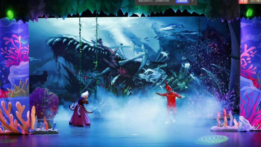 这场演出的舞美和服装,堪称 “行走的童话绘本”!充满童话色彩的海底制景的,搭配灵动的灯光效果,将珊瑚丛、沉船遗迹、水晶宫殿完美还原,仿佛下一秒就有鱼儿从身边游过~