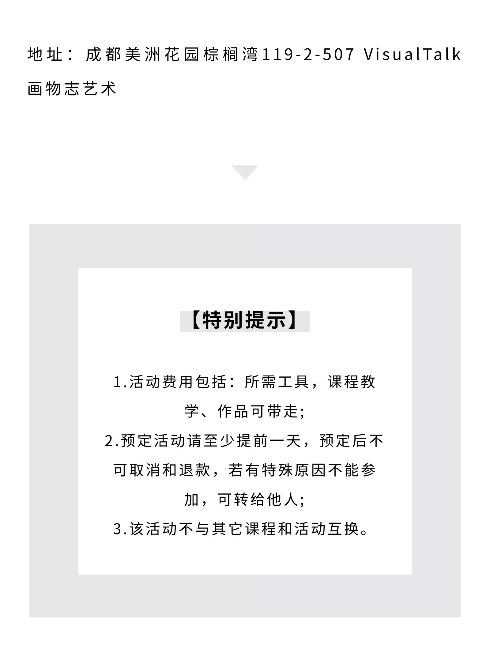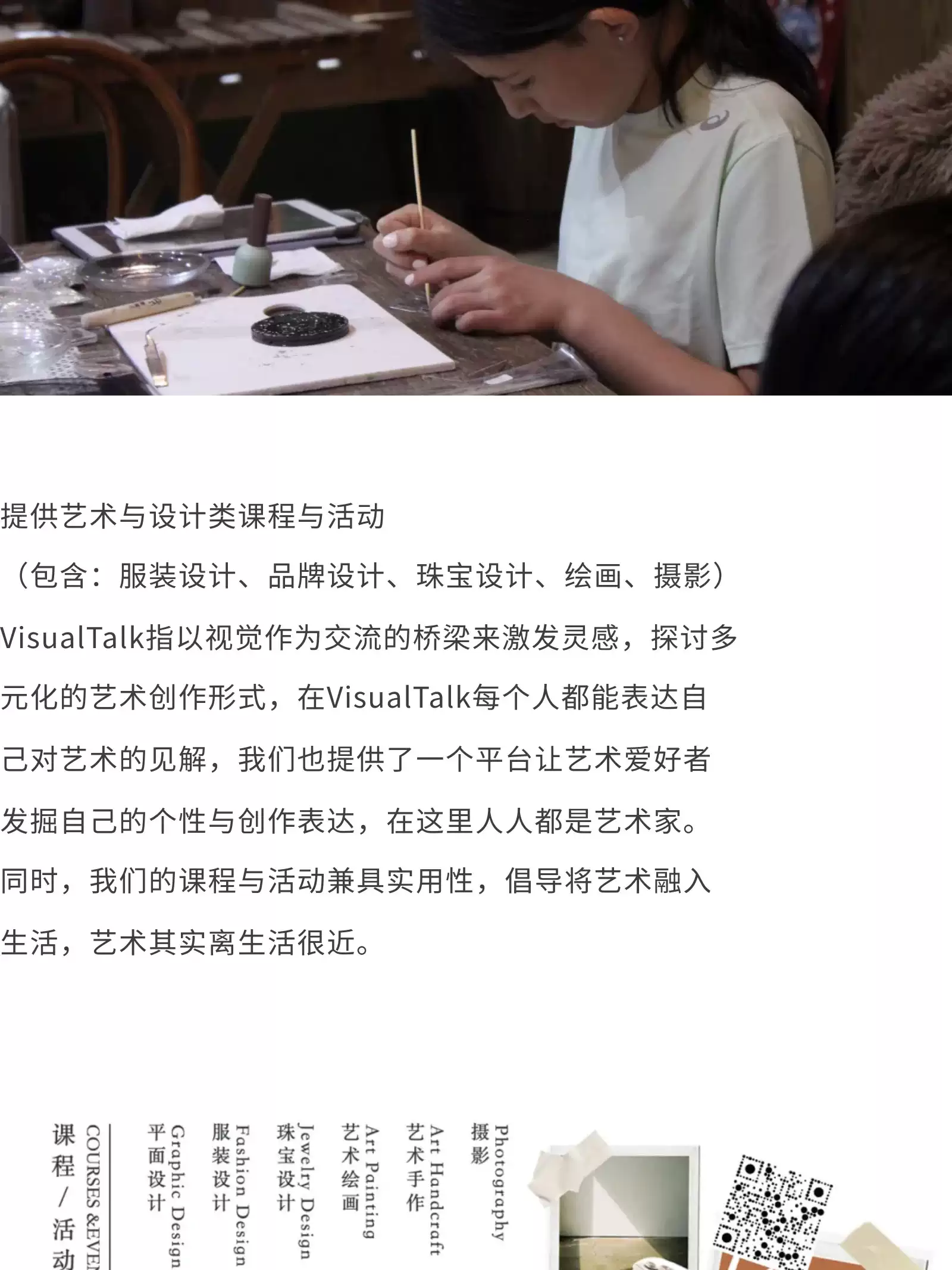 (包含:服装设计、品牌设计、珠宝设计、绘画、摄影)VisualTalk指以视觉作为交流的桥梁来激发灵感,探讨多元化的艺术创作形式,在VisualTalk每个人都能表达自己对艺术的见解,我们也提供了一个平台让艺术爱好者发掘自己的个性与创作表达,在这里人人都是艺术家。同时,我们的课程与活动兼具实用性,倡导将艺术融入生活,艺术其实离生活很近。