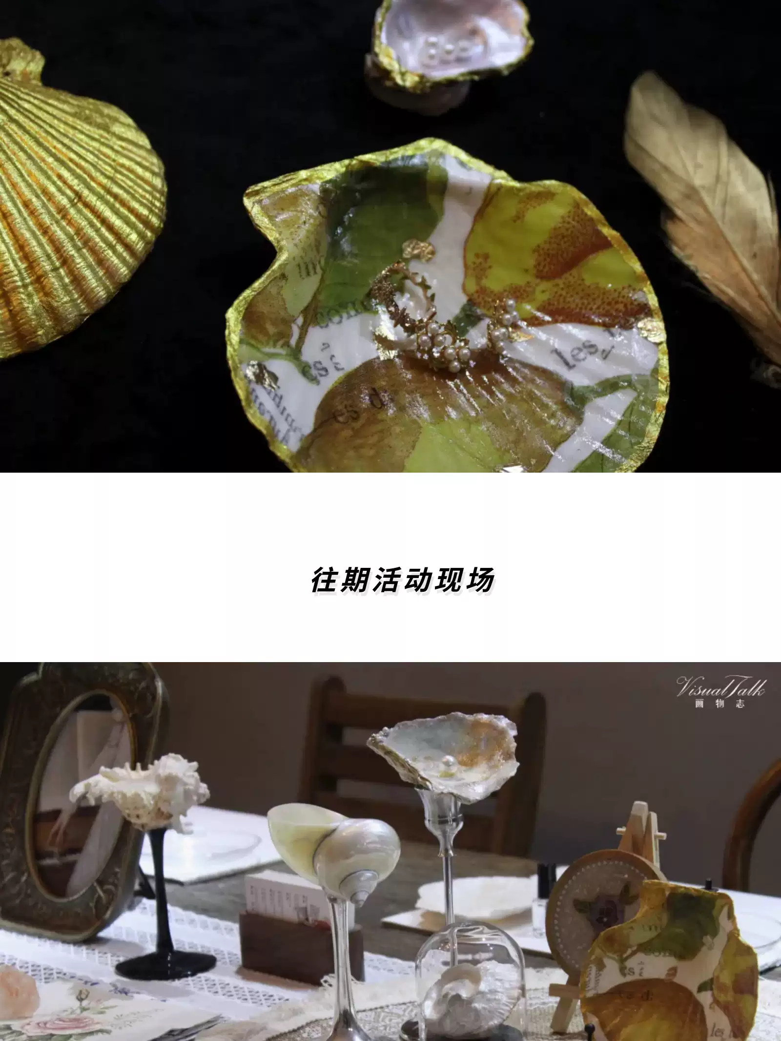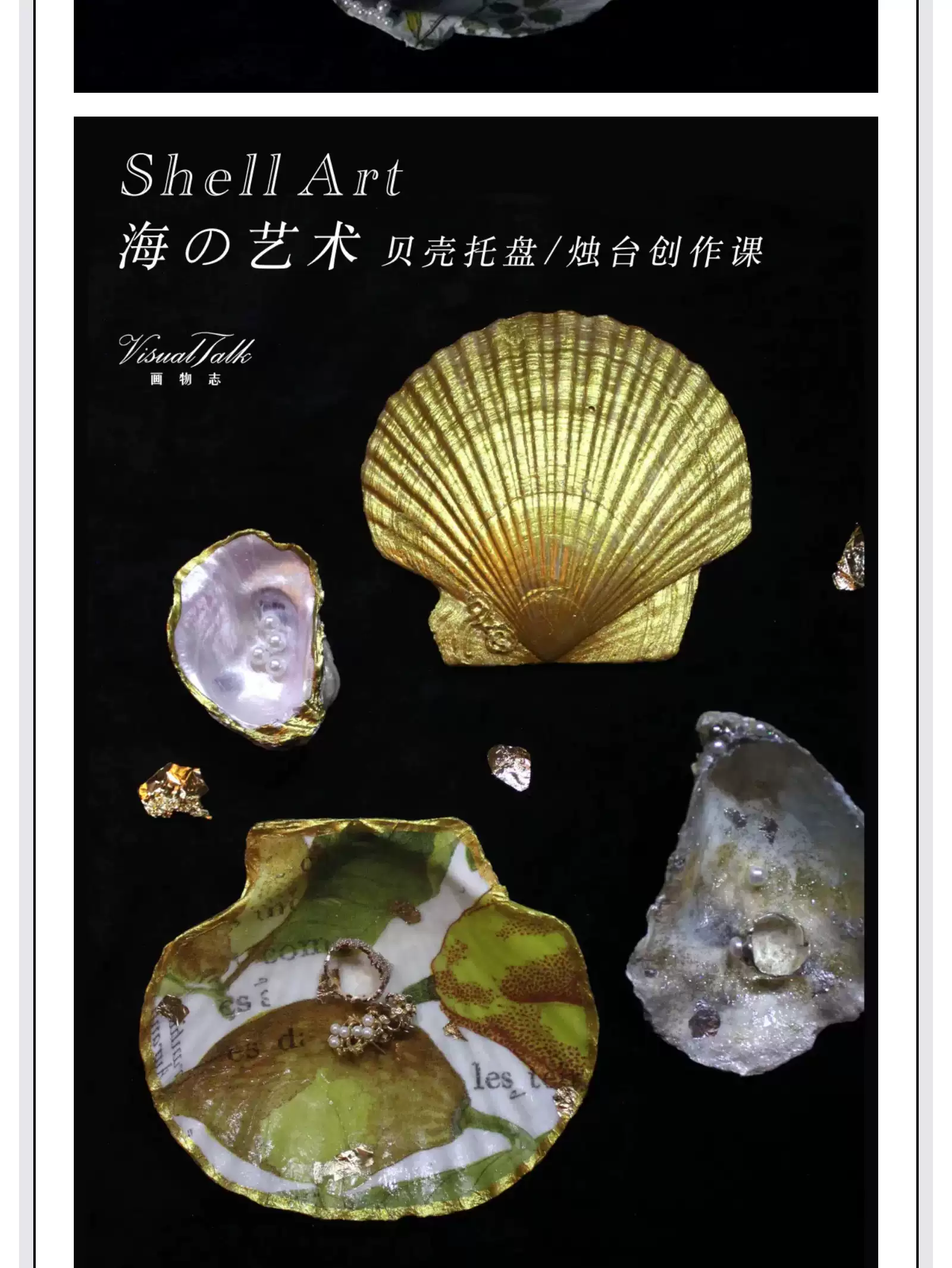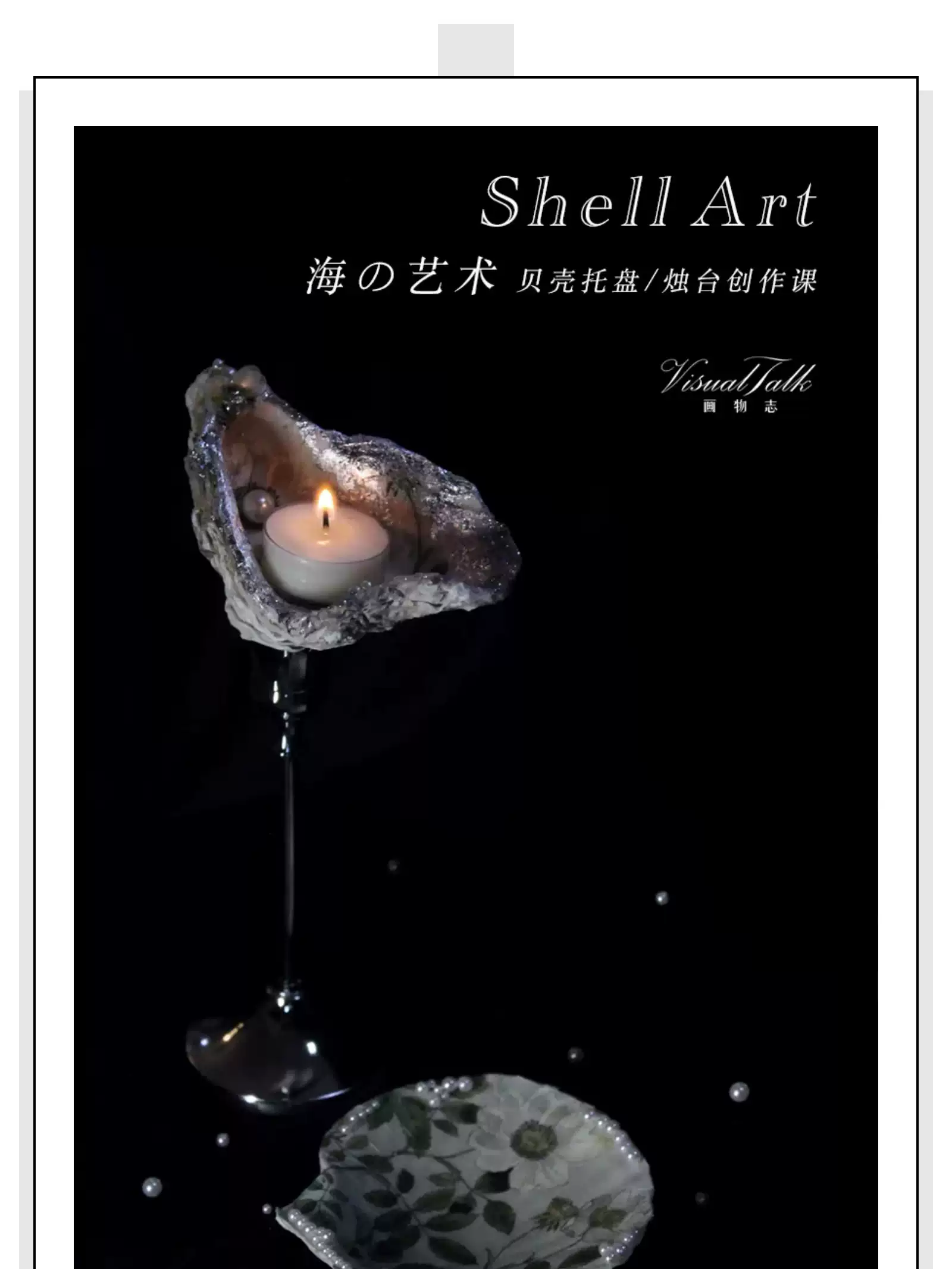 VisualTalk画物志艺术将开展海の艺术,贝壳托盘/烛台创作课,由专业艺术家指导,在海贝上创作创作艺术,将不同的材料与花纹结合贝壳自然的纹理,实现艺术与自然的完美统一,作品可作为家居烛台和托盘(可用于收纳配饰)。