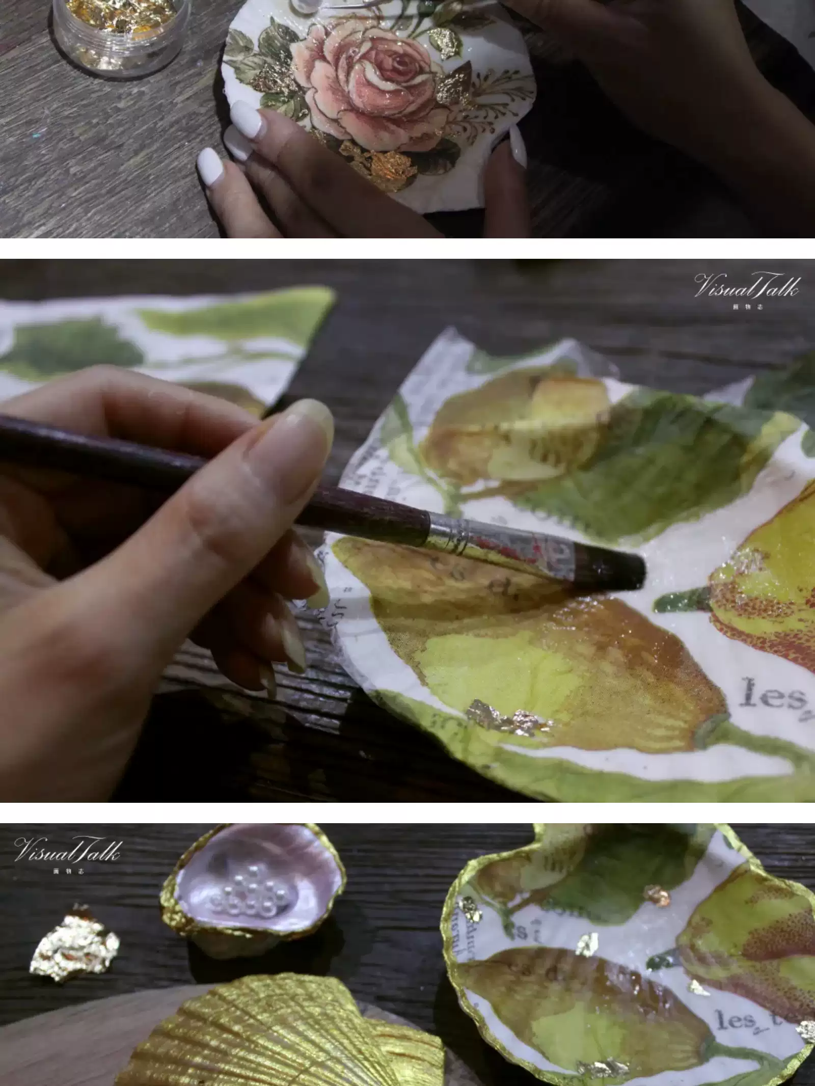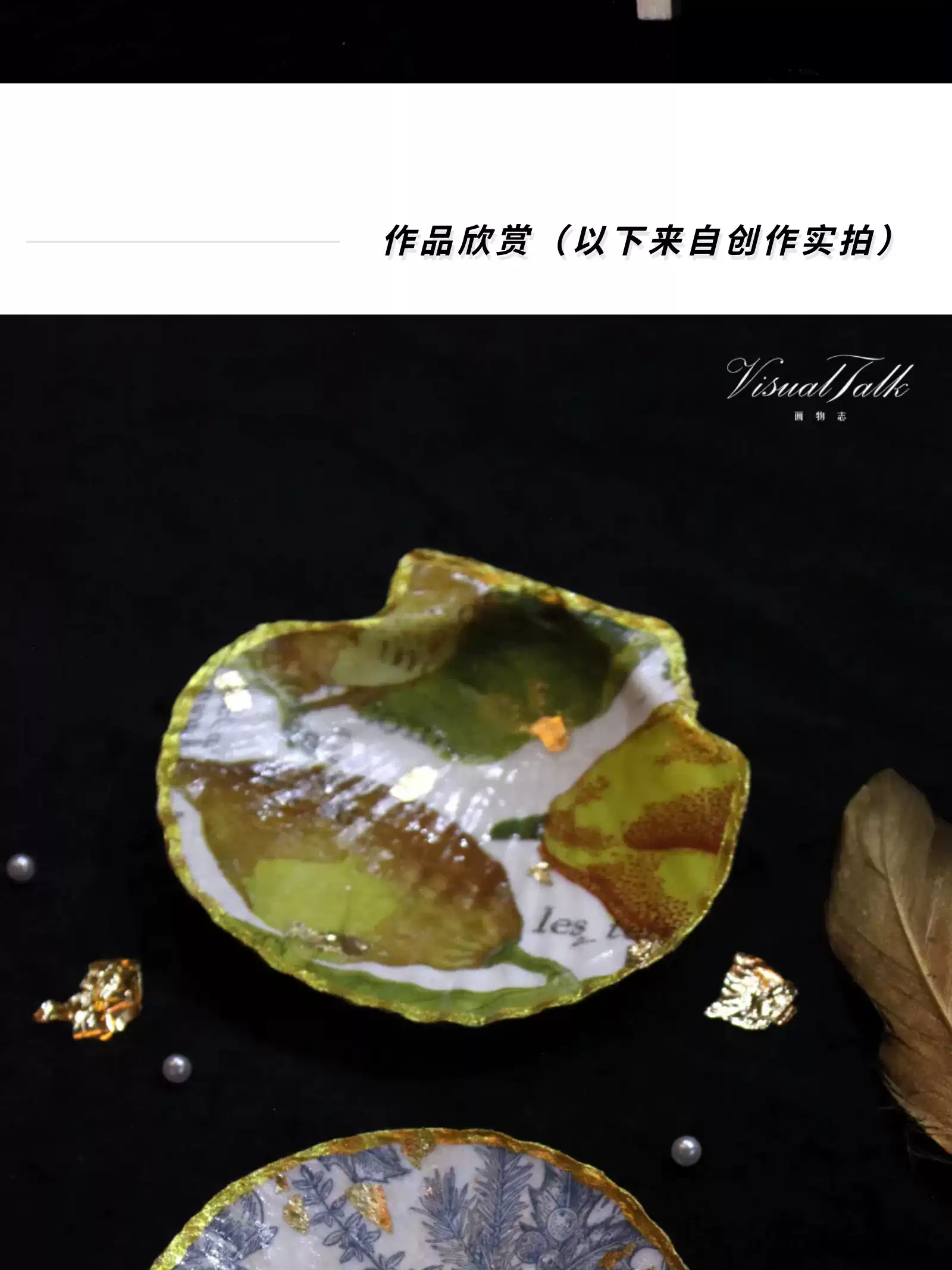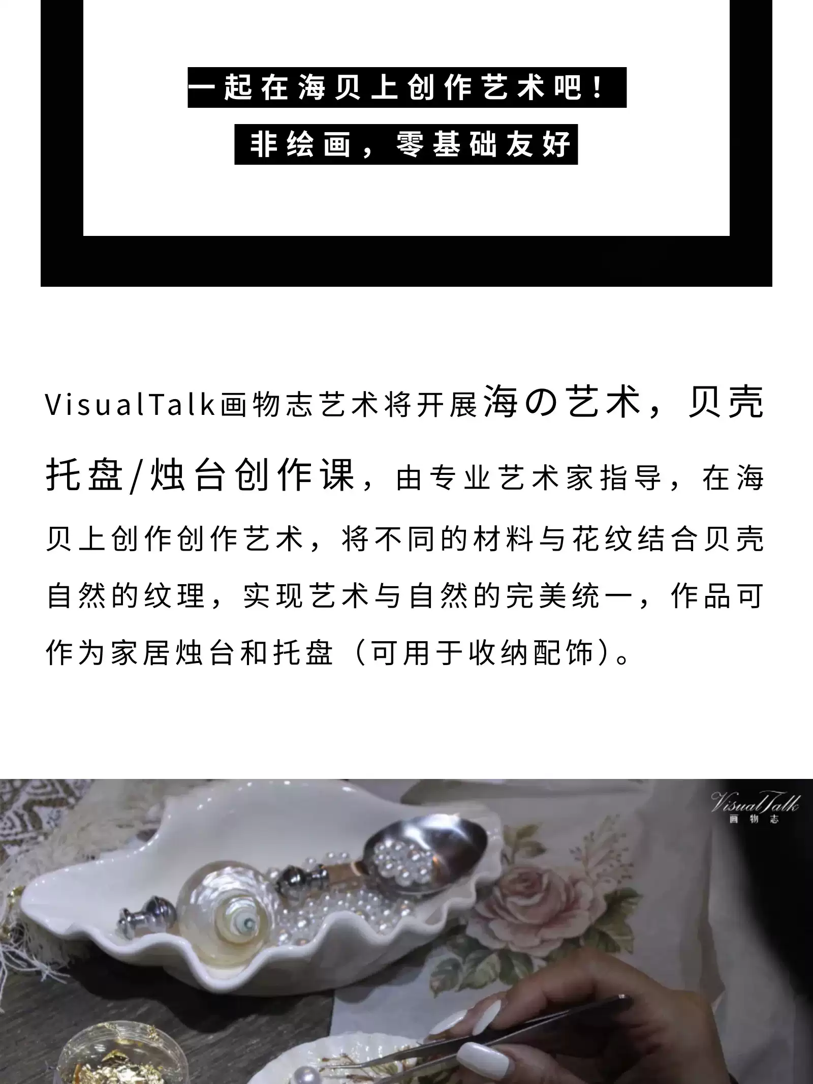 VisualTalk画物志艺术将开展海の艺术,贝壳托盘/烛台创作课,由专业艺术家指导,在海贝上创作创作艺术,将不同的材料与花纹结合贝壳自然的纹理,实现艺术与自然的完美统一,作品可作为家居烛台和托盘(可用于收纳配饰)。