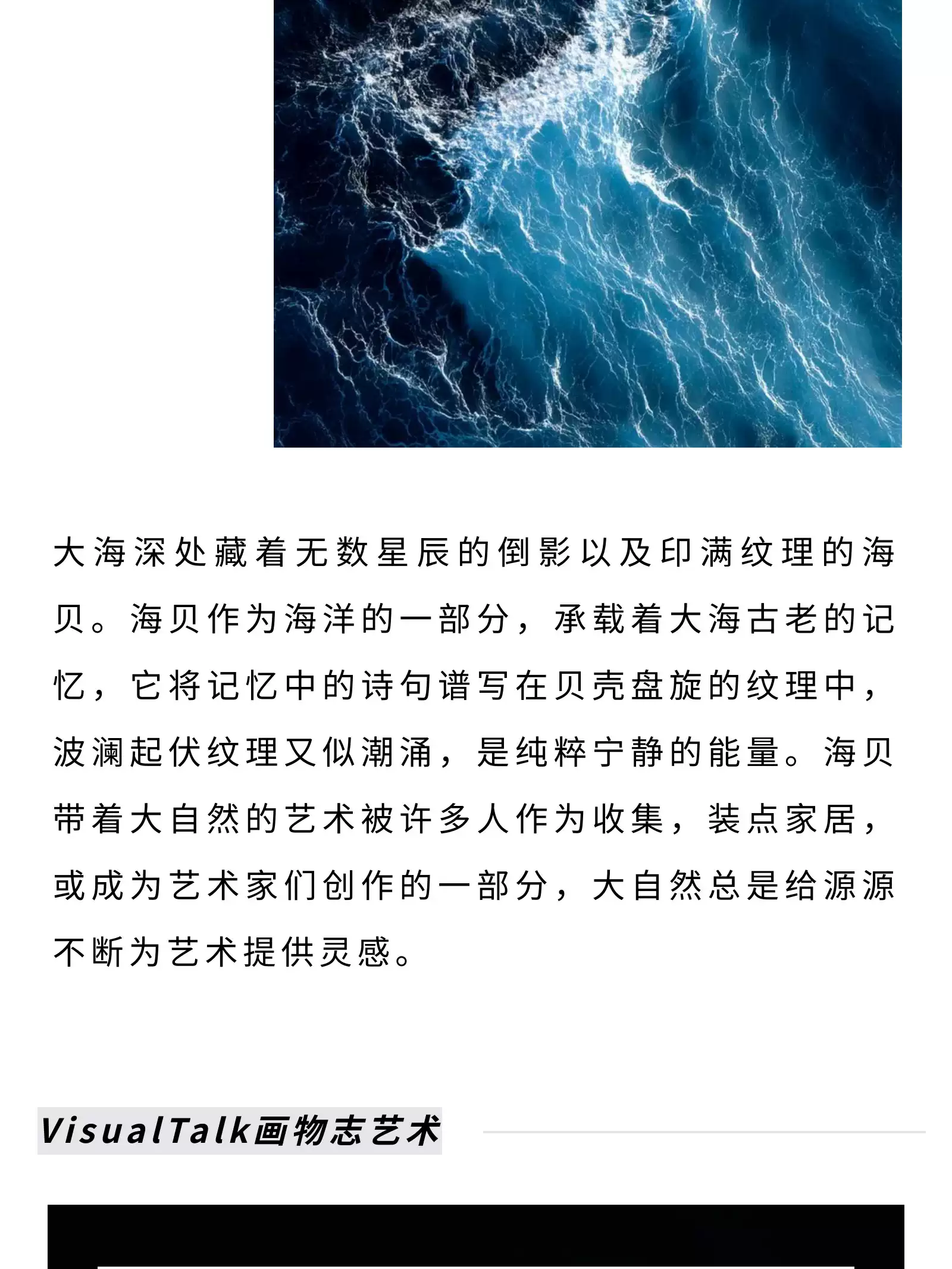 大海深处藏着无数星辰的倒影以及印满纹理的海贝。海贝作为海洋的一部分,承载着大海古老的记忆,它将记忆中的诗句谱写在贝壳盘旋的纹理中波澜起伏纹理又似潮涌,是纯粹宁静的能量。海贝带着大自然的艺术被许多人作为收集,装点家居或成为艺术家们创作的一部分,大自然总是给源源不断为艺术提供灵感。