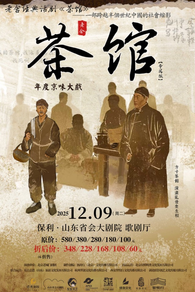 12月9日,老舍经典话剧《茶馆》专属版将来到山东省会大剧院,邀你走进一座茶馆,回顾三段历史,品味百态人生。