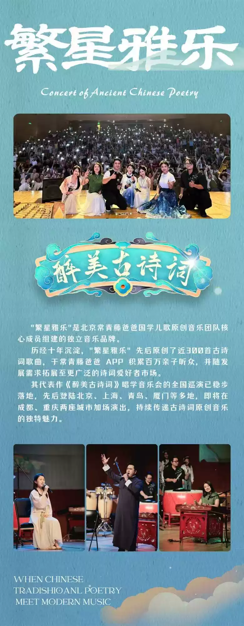 常青藤爸爸携手顶尖音乐团队,倾力打造「醉美古诗词·繁星雅乐」专场音乐会,以现代音乐语言重构经典诗词意境。李白笔下"举杯邀明月"的豪情,李清照词中"人比黄花瘦"的婉约,皆化作悠扬旋律与灵动舞姿,在繁星点缀的舞台间流转。2026年1月24日,让我们相约五棵松·爱乐汇艺术空间·都市音乐厅,共赴一场诗乐交融的东方美学之旅。