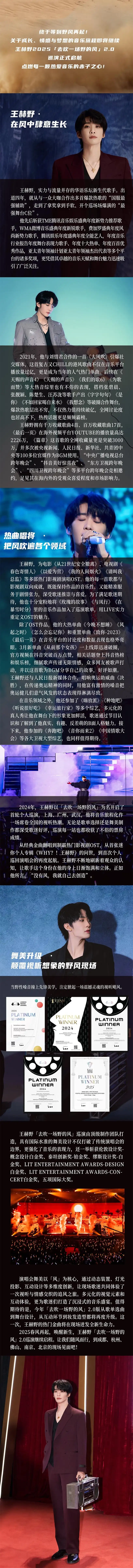 2024年,王赫野以「去吹一场野的风」为名开启了首轮个人巡演,上海、广州、武汉,他将音乐旅程化作场席卷全国的视听热潮。无论是歌单选择还是舞美制作都深受歌迷好评,巡演每一站也都收获了不俗的票房成绩。