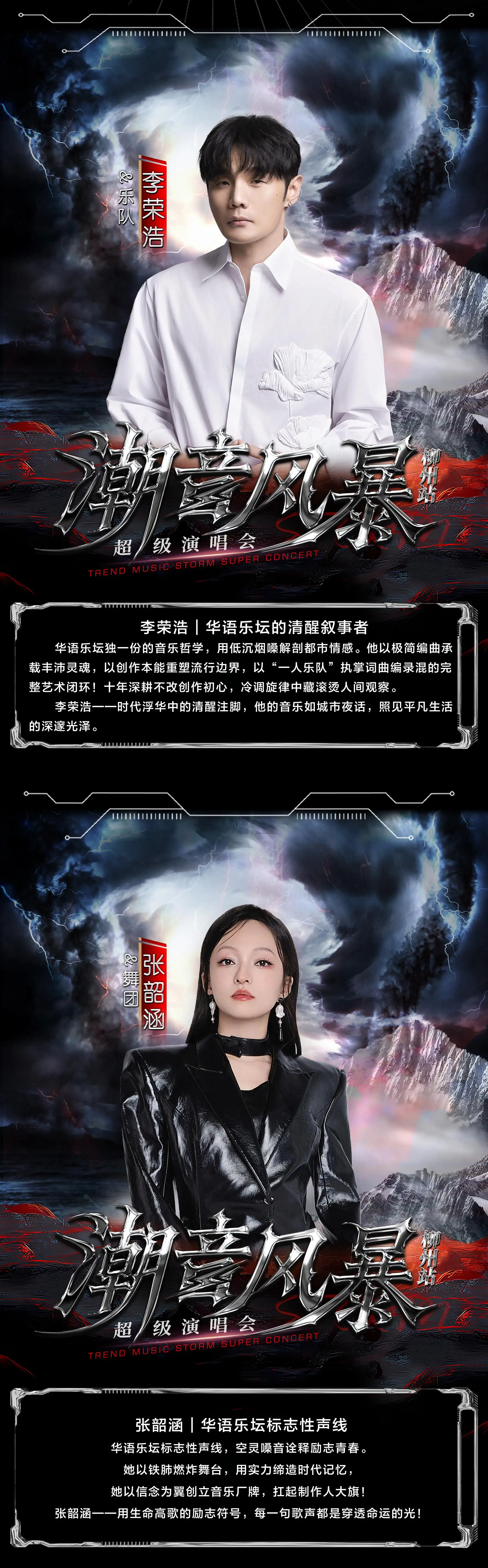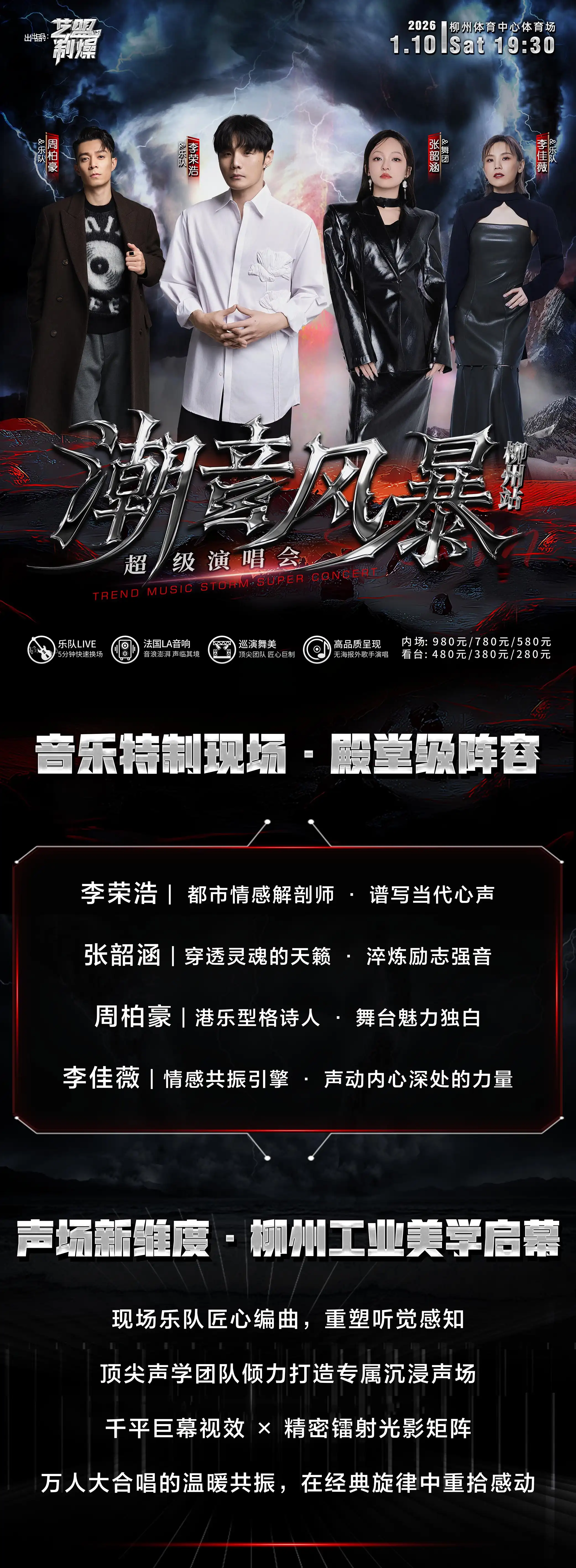 2026年1月10日,柳州体育中心体育场将化身音乐宇宙,李荣浩、张韶涵、周柏豪、李佳薇四位华语顶流歌手集结,以“潮音风暴”掀起万人狂欢!这场演唱会以国际级制作标准打造沉浸式体验:千平巨幕视效与精密镭射光影交织,顶尖声学团队匠心调校,现场乐队重塑听觉层次,让每一声吟唱都直击心灵。