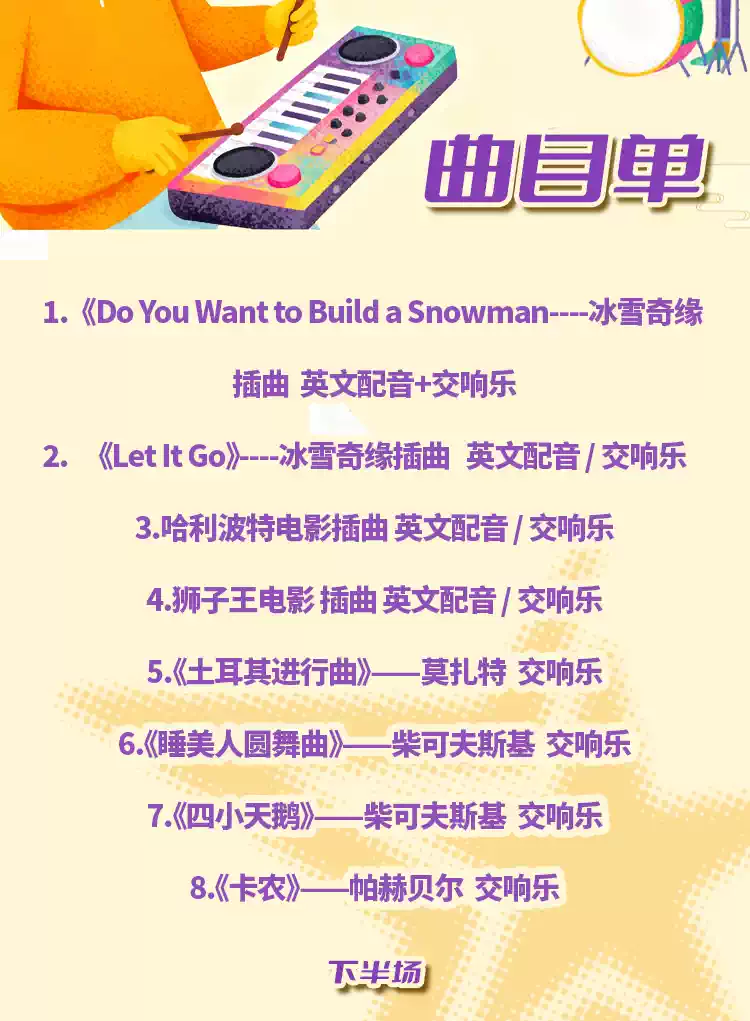 针对精心甄选的动画电影,现场的英文配音让您的孩子在多维的语境下与全球接轨,拓展不一样的领导力、创造力,将舞台艺术与语言艺术相结合,激发不一样的视角,开启一场全球音乐之旅。
