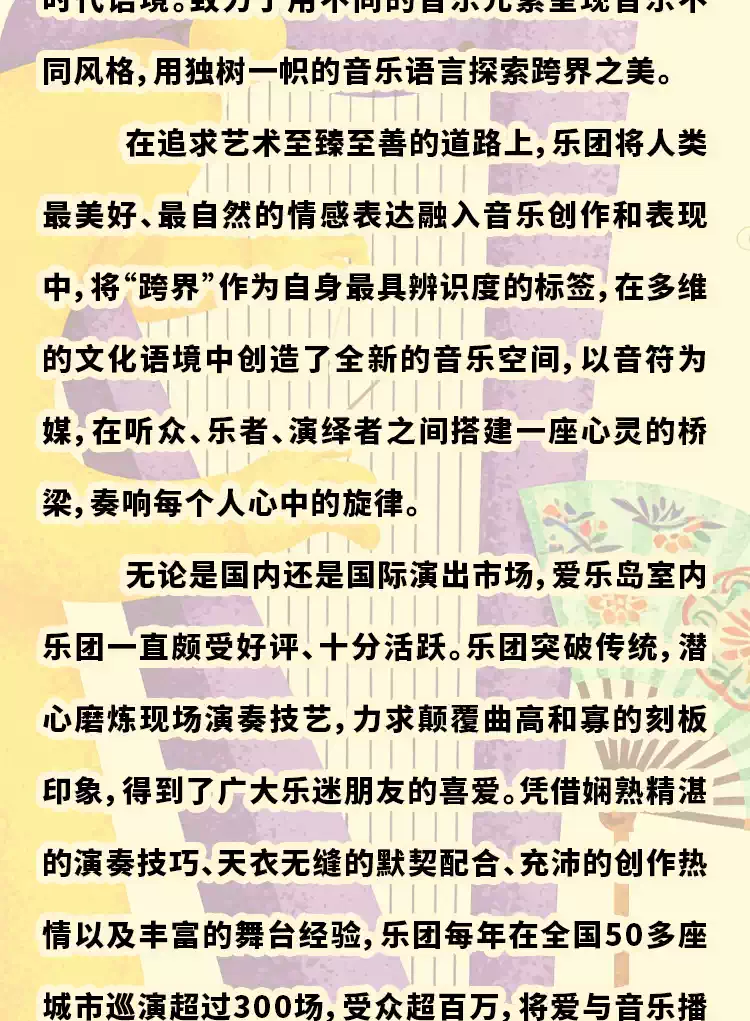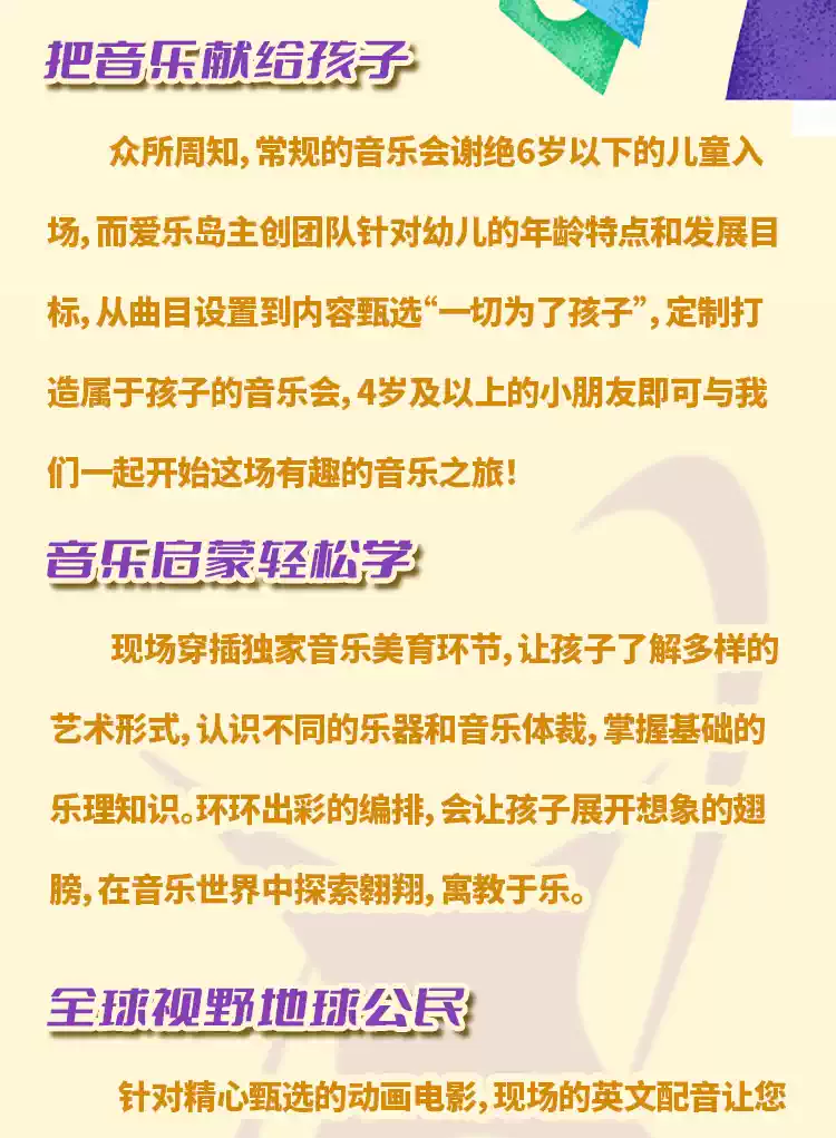 众所周知,常规的音乐会谢绝6岁以下的儿童入场,而爱乐岛主创团队针对幼儿的年龄特点和发展目标,从曲目设置到内容甄选“一切为了孩子”,定制打造属于孩子的音乐会,4岁及以上的小朋友即可与我们一起开始这场有趣的音乐之旅!