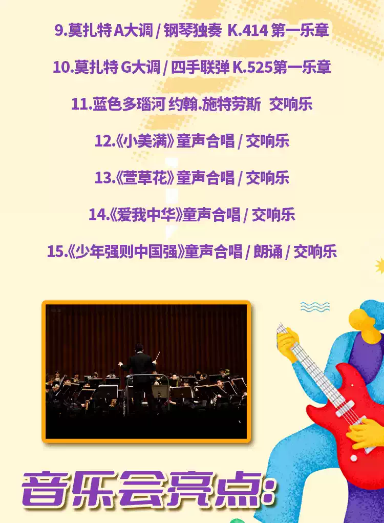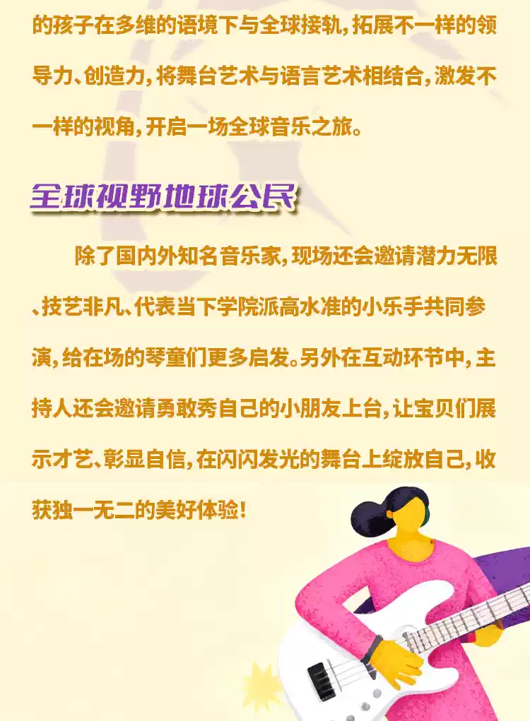 除了国内外知名音乐家,现场还会邀请潜力无限、技艺非凡、代表当下学院派高水准的小乐手共同参演,给在场的琴童们更多启发。另外在互动环节中,主持人还会邀请勇敢秀自己的小朋友上台,让宝贝们展示才艺、彰显自信,在闪闪发光的舞台上绽放自己,收获独一无二的美好体验!