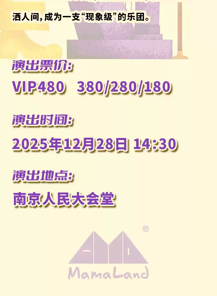 演出时间 2025-12-28 周日 14:30 演出场馆 南京人民大会堂 演出时长 以现场为准 儿童入场提示 儿童一律凭成人票入场 演出详情