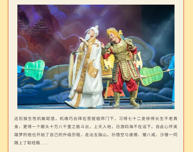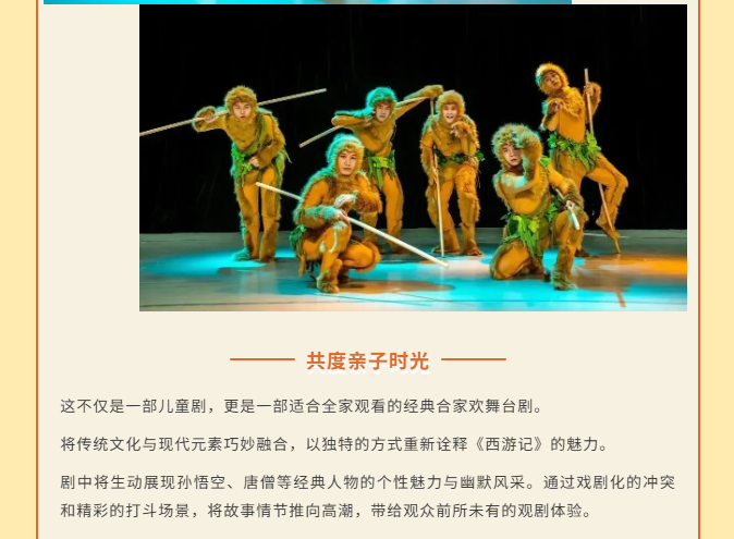 这不仅是一部儿童剧,更是一部适合全家观看的经典合家欢舞台剧。将传统文化与现代元素巧妙融合,以独特的方式重新诠释《西游记》的魅力。剧中将生动展现孙悟空、唐僧等经典人物的个性魅力与幽默风采。通过戏剧化的冲突和精彩的打斗场景,将故事情节推向高潮,带给观众前所未有的观剧体验。