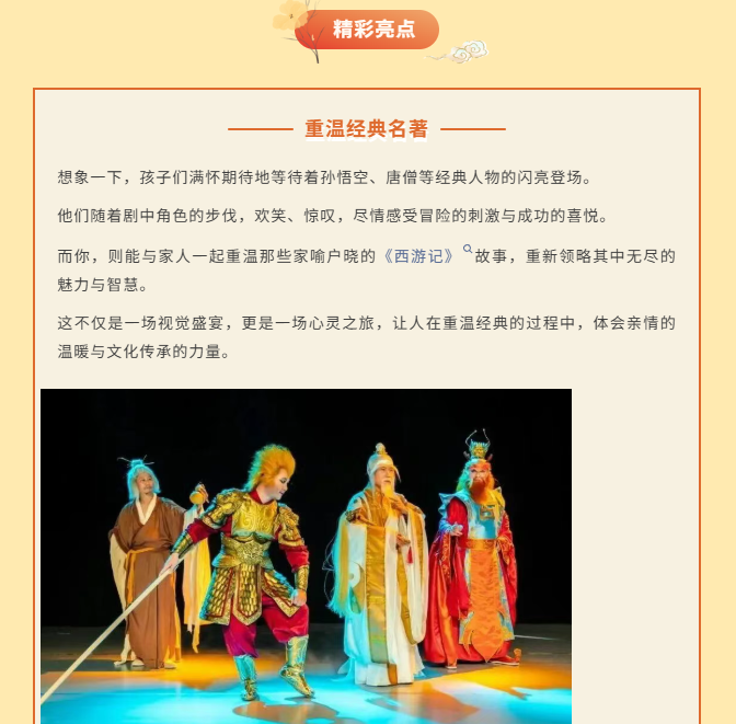 想象一下,孩子们满怀期待地等待着孙悟空、唐僧等经典人物的闪亮登场。他们随着剧中角色的步伐,欢笑、惊叹,尽情感受冒险的刺激与成功的喜悦。而你,则能与家人一起重温那些家喻户晓的《西游记》“故事,重新领略其中无尽的魅力与智慧。