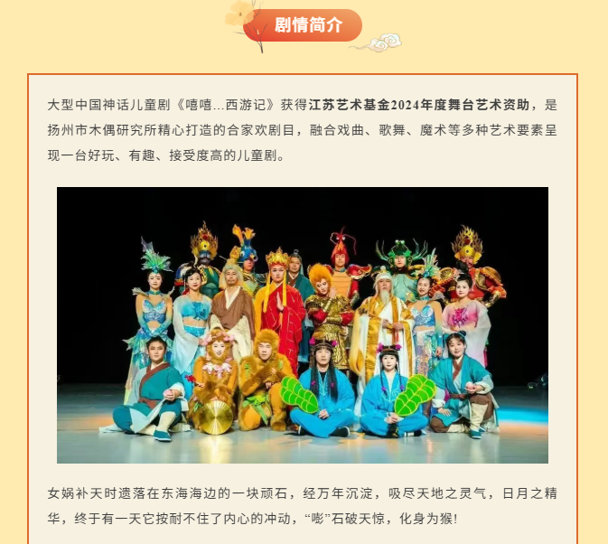 大型中国神话儿童剧《嘻嘻..西游记》获得江苏艺术基金2024年度舞台艺术资助,是扬州市木偶研究所精心打造的合家欢剧目,融合戏曲、歌舞、术等多种艺术要素呈现一台好玩、有趣、接受度高的儿童剧。