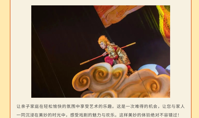 让亲子家庭在轻松愉快的氛围中享受艺术的乐趣。这是一次难得的机会,让您与家人一同沉浸在美妙的时光中,感受戏剧的魅力与欢乐。这样美妙的体验绝对不容错过!