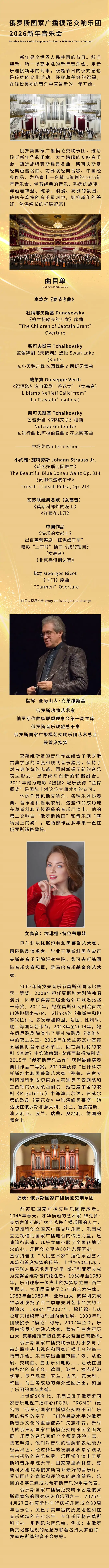 俄罗斯国家广播模范交响乐团邀您聆听新年华彩乐章,大气磅礴的交响音乐会,甄选施特劳斯经典名曲、柴可夫斯基经典芭蕾名曲、前苏联经典名歌、中国经典作品,为您奉上一台精心策划的2026新年音乐会,伴着经典的音乐,熟悉的旋律,洋溢着神圣、纯净、浪漫、高雅的氛围,使您在欢快的音乐星河中,拥抱新年的美好,沐浴绵长的祥瑞祝愿!