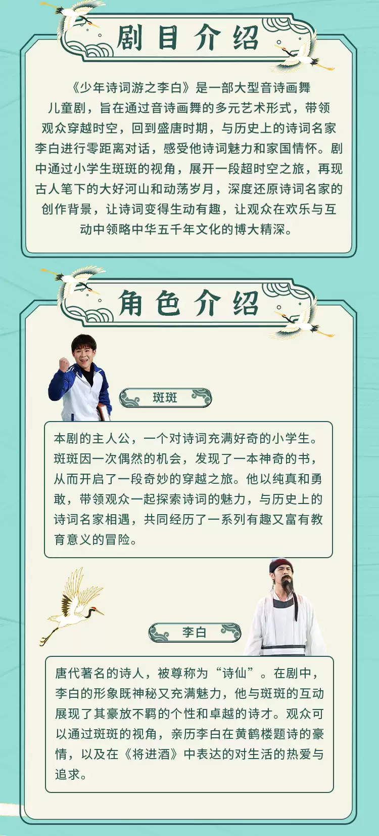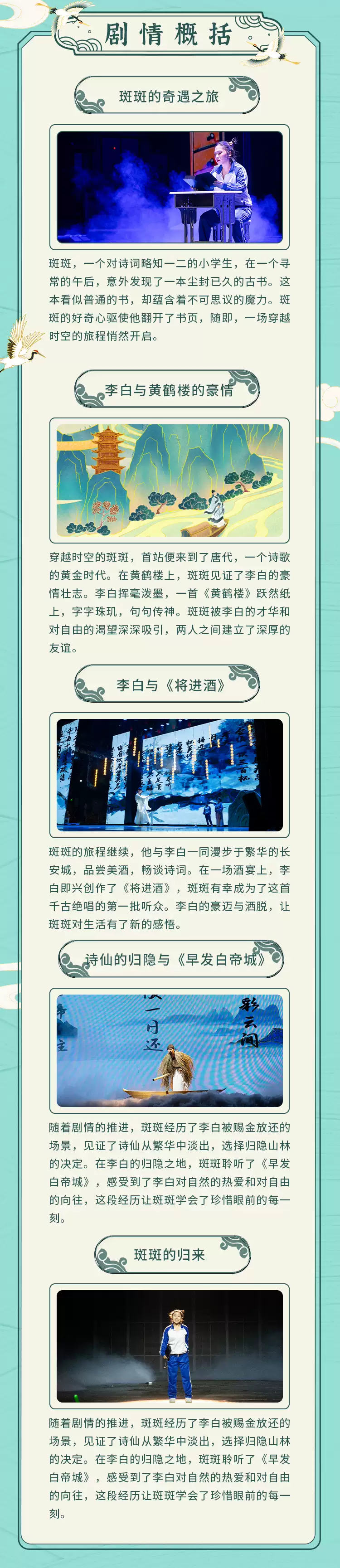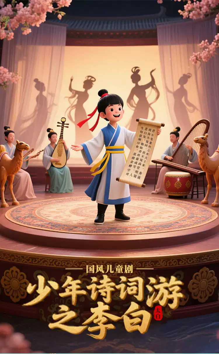 《少年诗词游之李白》是一部大型音诗画舞儿童剧,旨在通过音诗画舞的多元艺术形式,带领观众穿越时空,回到盛唐时期,与历史上的诗词名家李白进行零距离对话,感受他诗词魅力和家国情怀。剧中通过小学生斑斑的视角,展开一段超时空之旅,再现古人笔下的大好河山和动荡岁月,深度还原诗词名家的创作背景,让诗词变得生动有趣,让观众在欢乐与互动中领略中华五千年文化的博大精深。