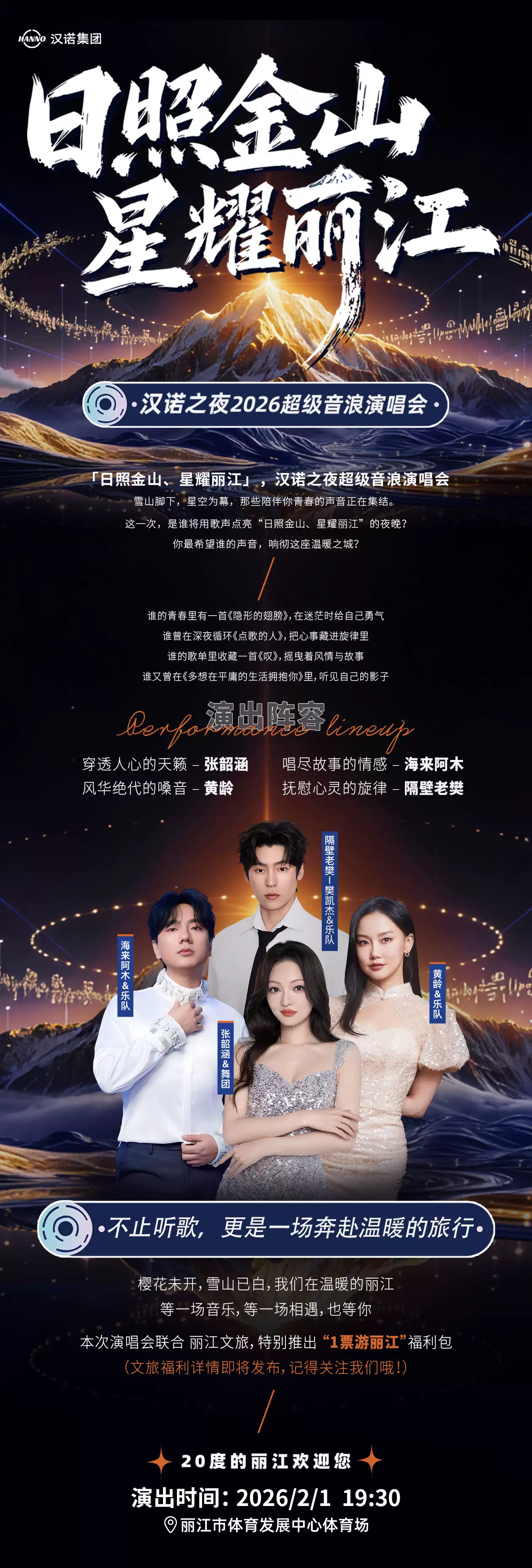 2026年2月1日,星耀丽江·汉诺之夜2026超级音浪演唱会走进丽江市体育场,邀你踏入一次与所有美好共赴的约会~